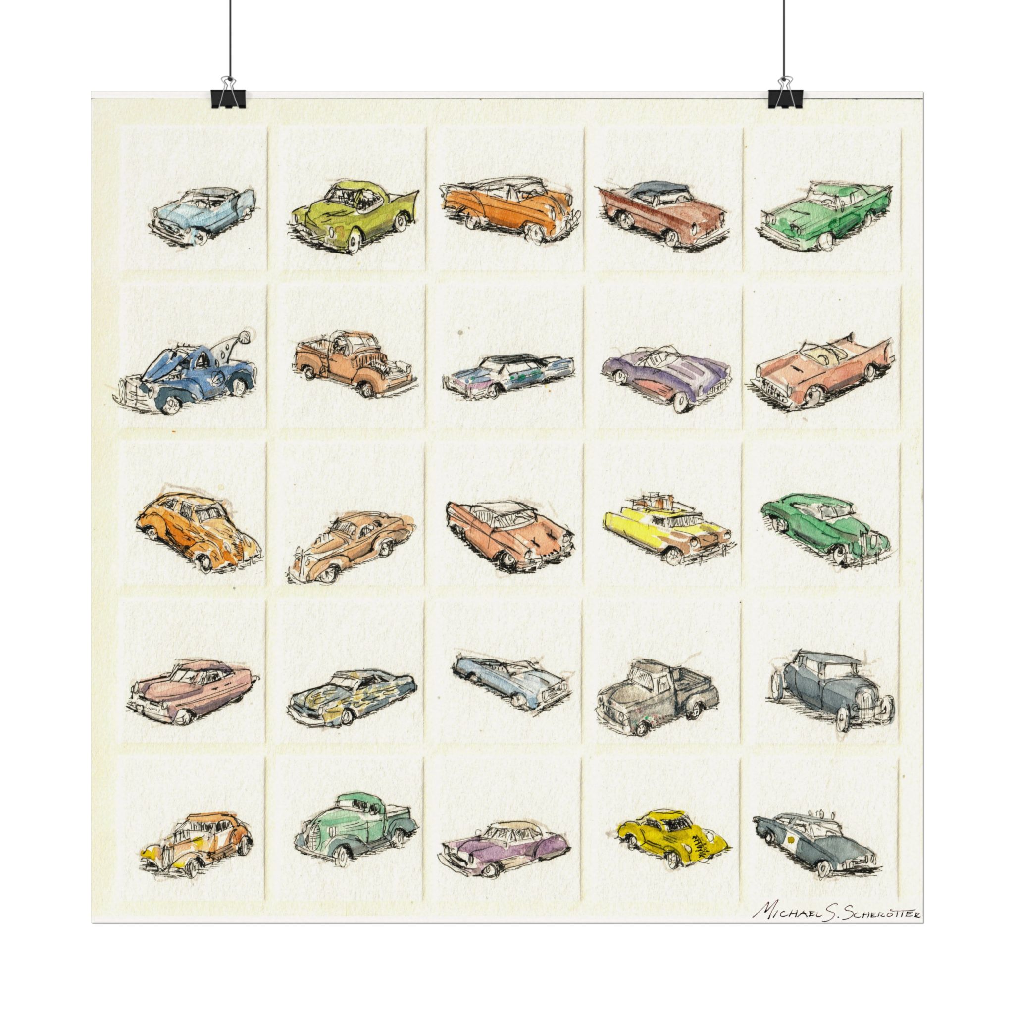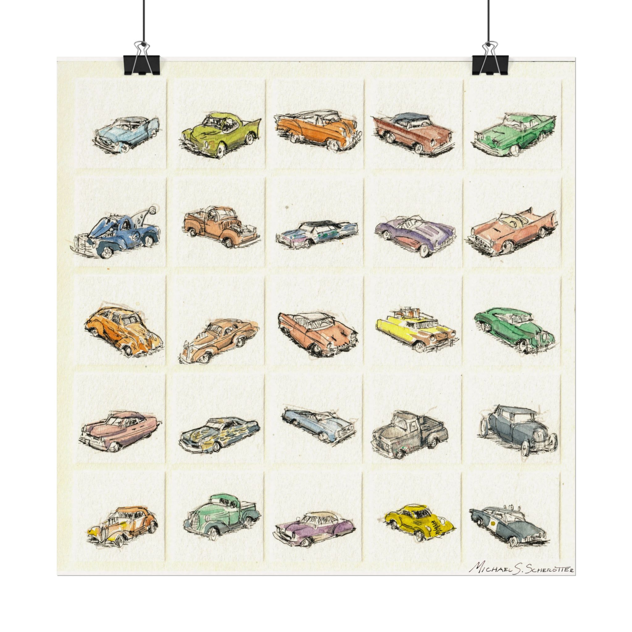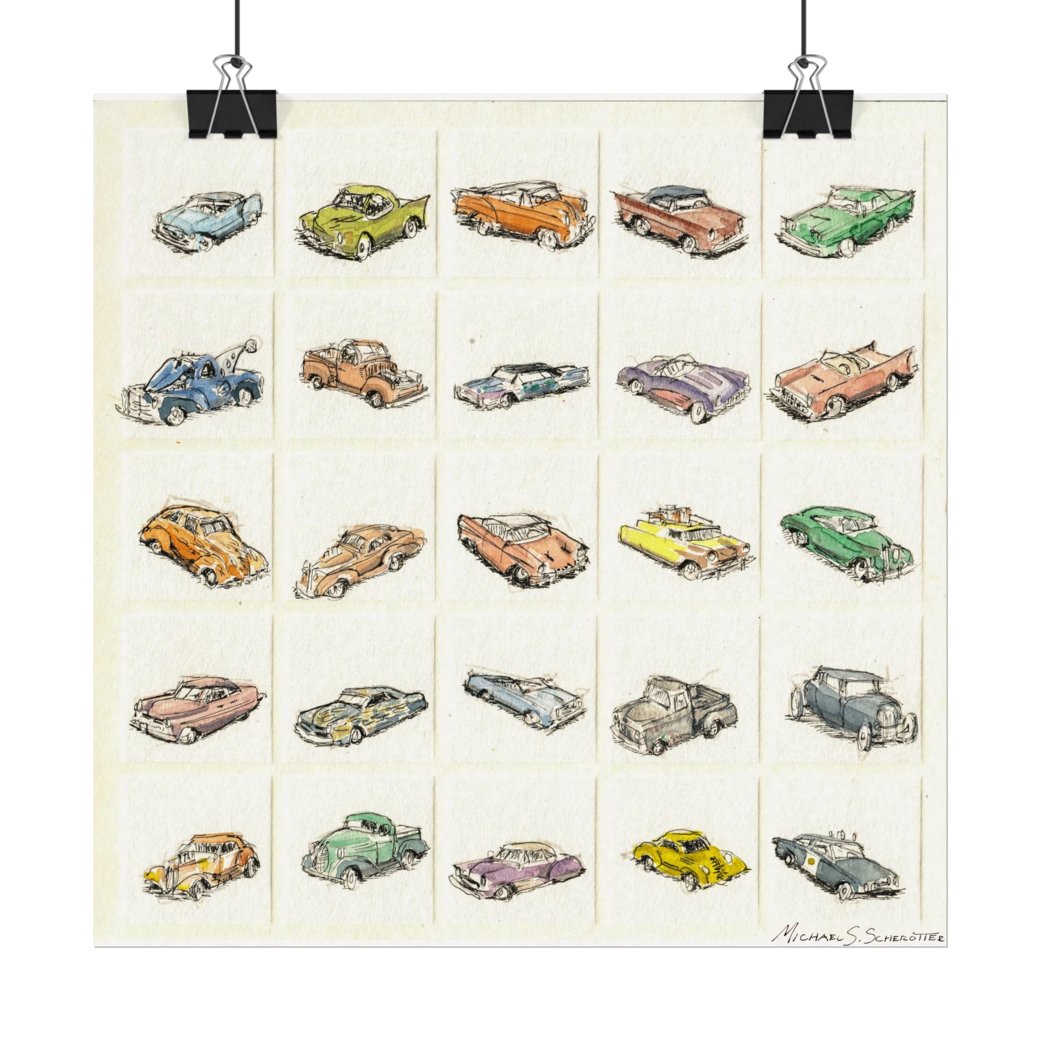 This textured watercolor matte poster brings vintage car charm into any room with soft, hand-painted colors and a delicate paper grain. Each small car sketch sits inside a subtle grid, creating a nostalgic collage that feels like a page from an artist’s travel journal. The muted palette and tactile watercolor paper lend warmth and quiet personality to living rooms, home offices, nurseries, or garages turned cozy studios. Hang it alone for a gentle focal point or pair with other prints to build a curated wall that nods to road trips, weekend tinkering, and slow afternoons spent sketching by the window.