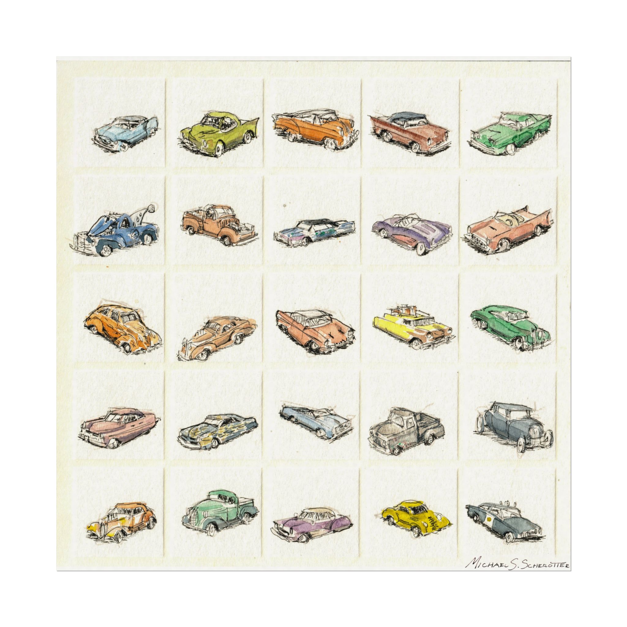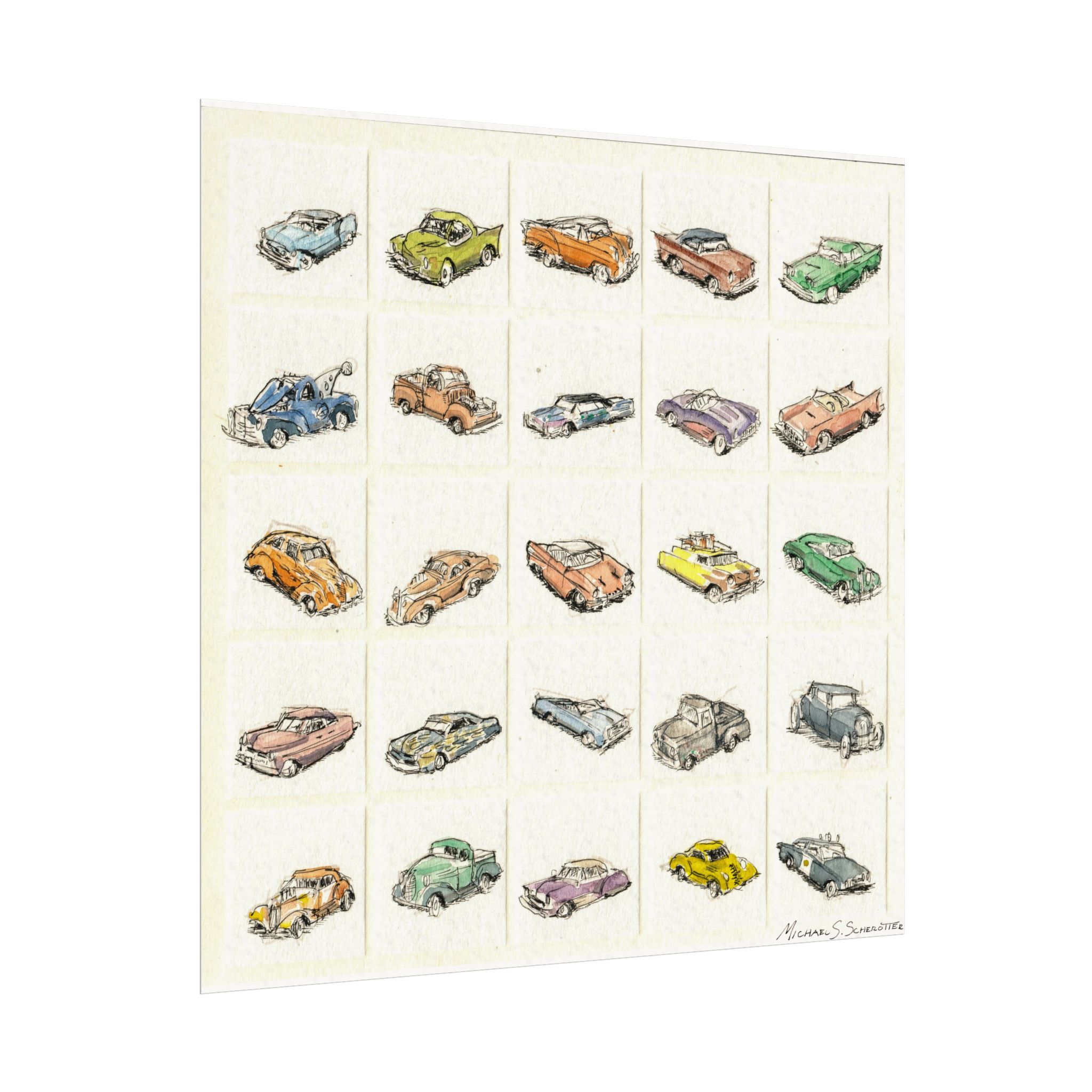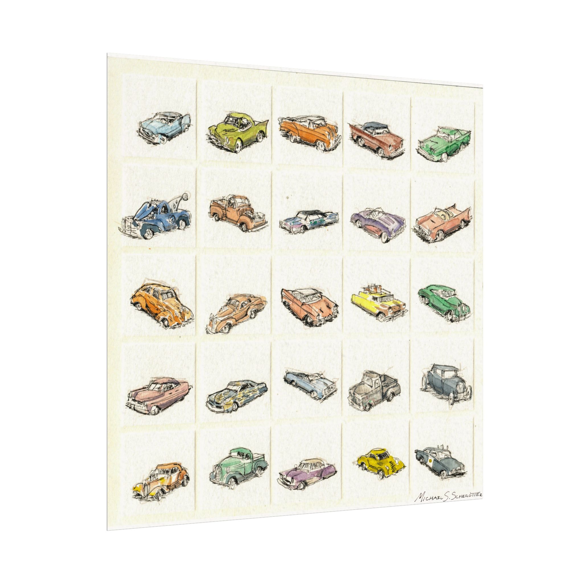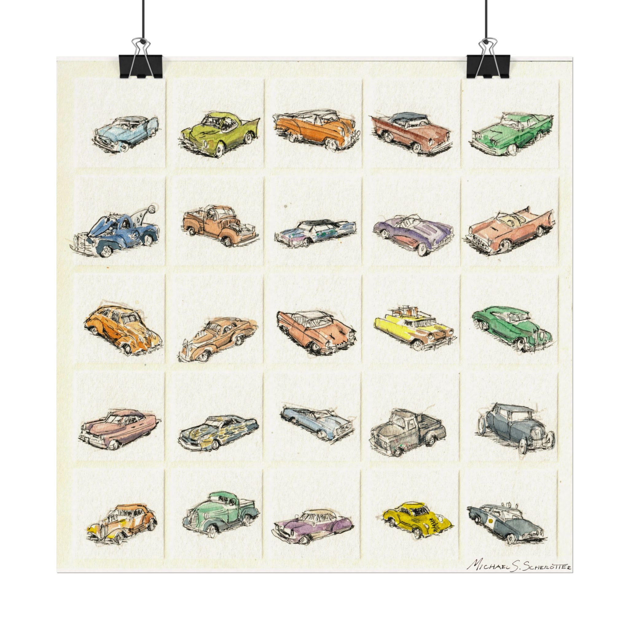 This textured watercolor matte poster brings vintage car charm into any room with soft, hand-painted colors and a delicate paper grain. Each small car sketch sits inside a subtle grid, creating a nostalgic collage that feels like a page from an artist’s travel journal. The muted palette and tactile watercolor paper lend warmth and quiet personality to living rooms, home offices, nurseries, or garages turned cozy studios. Hang it alone for a gentle focal point or pair with other prints to build a curated wall that nods to road trips, weekend tinkering, and slow afternoons spent sketching by the window.