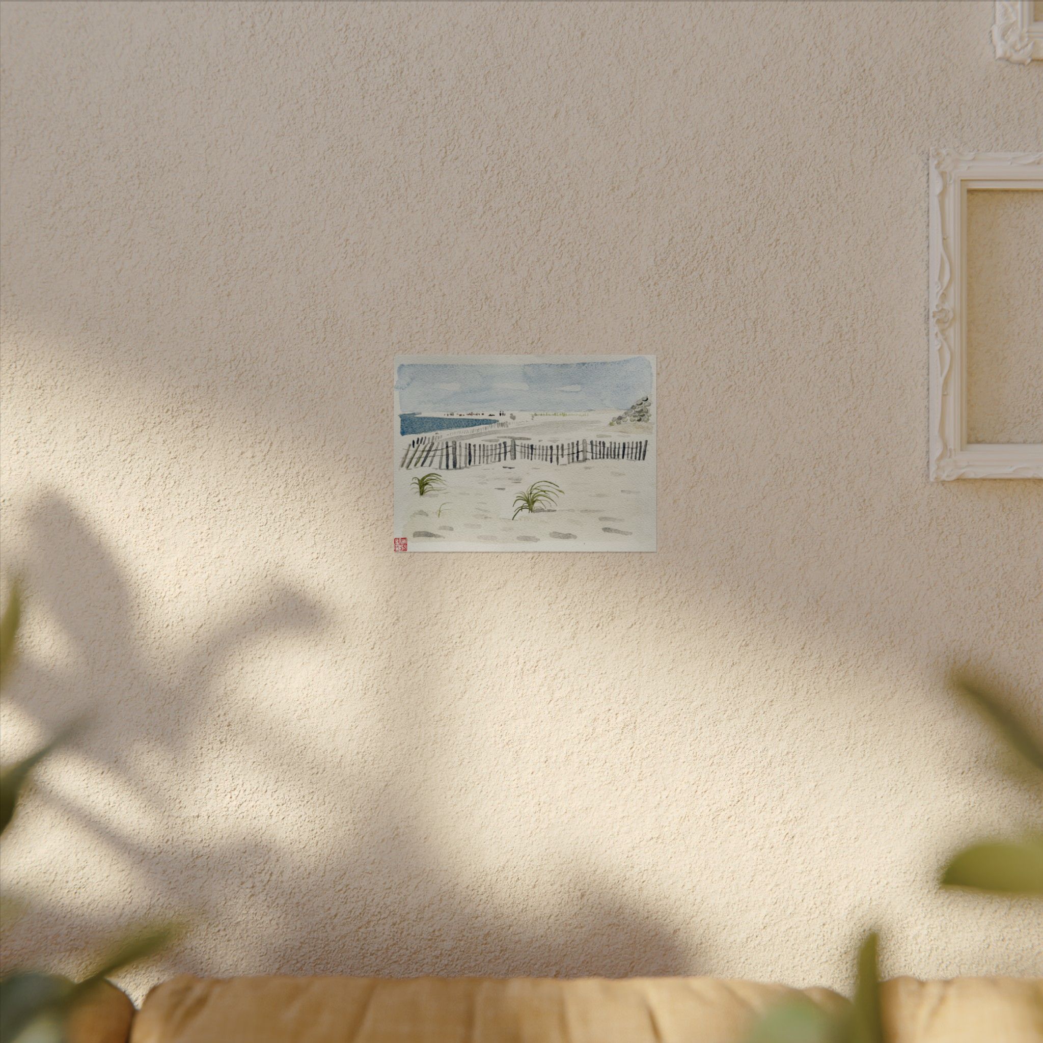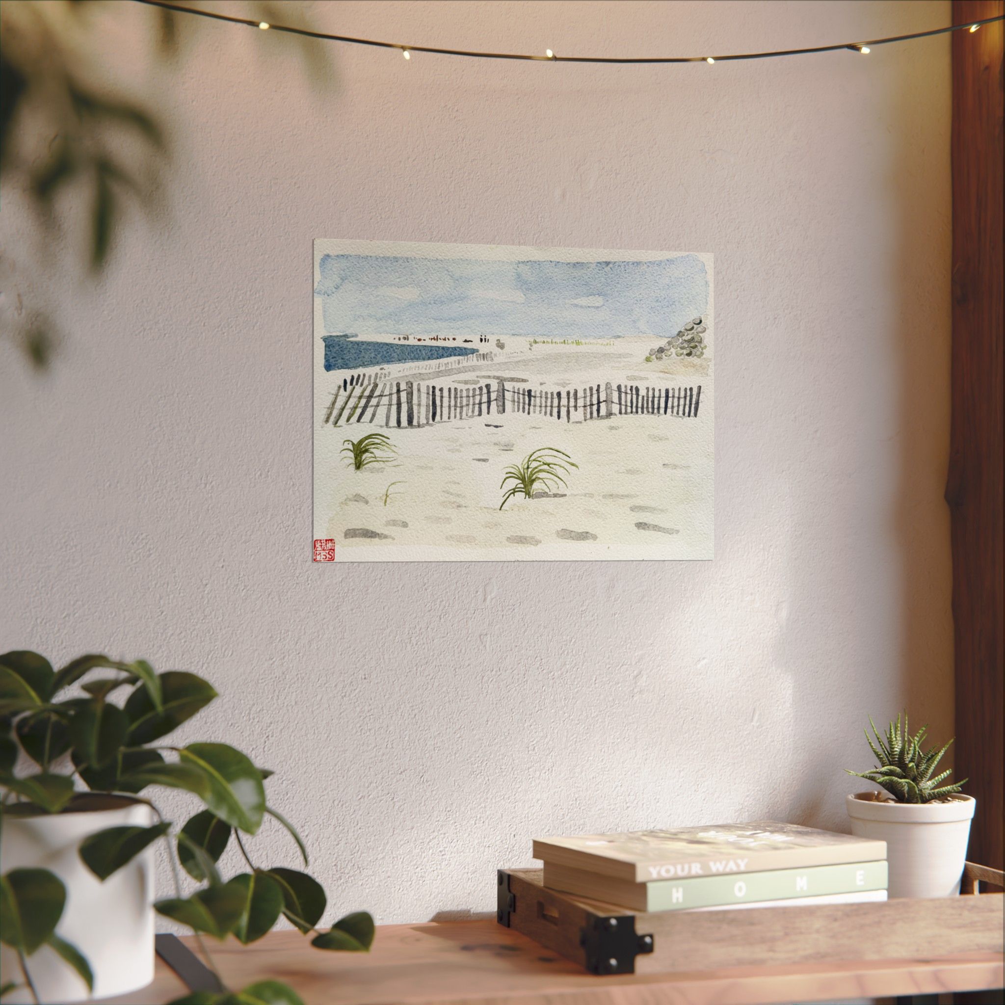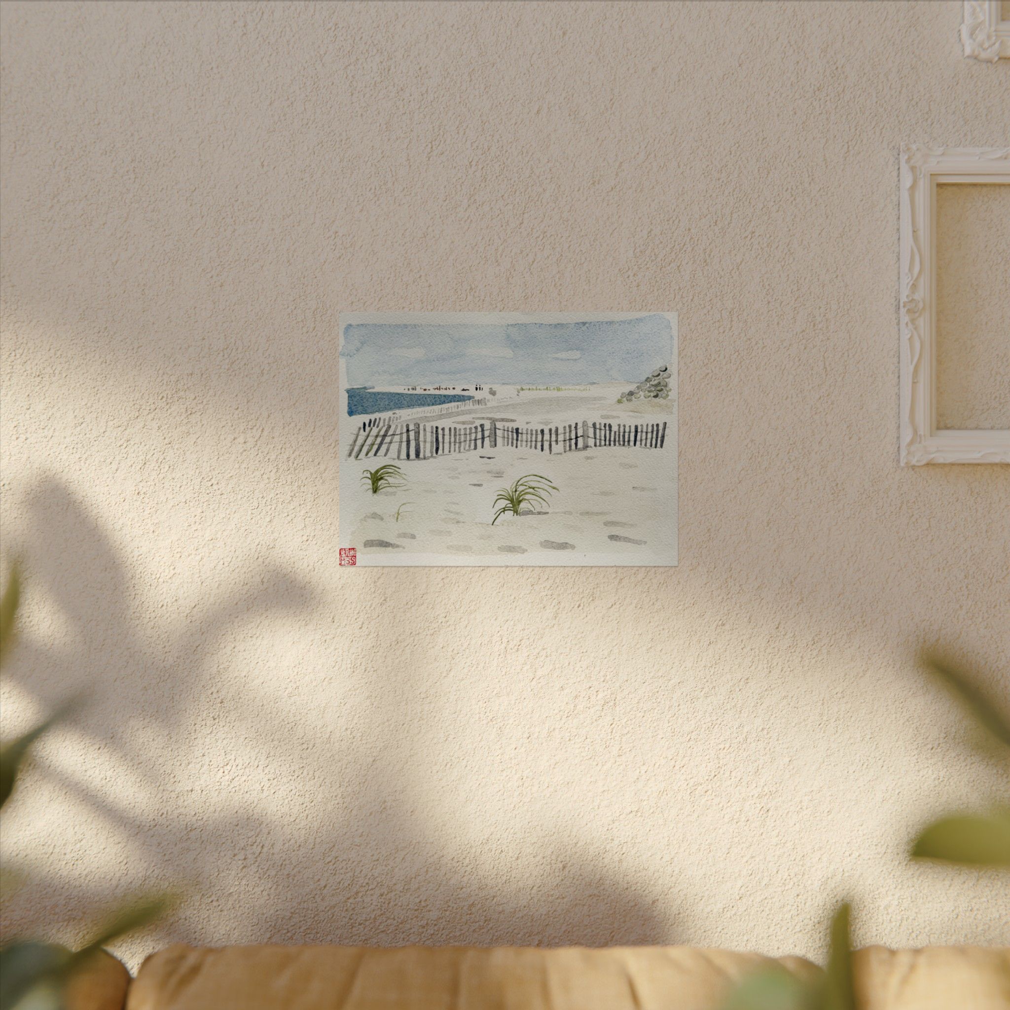 A soft, coastal watercolor scene printed on textured matte paper that feels like handmade art on your wall. Gentle washes of blues and sandy neutrals capture a quiet beach moment—dune grass, a weathered fence, and a distant pier—rendered with subtle brushstrokes and a natural paper grain that shows in every print. This poster slips easily into relaxed living rooms, sunlit hallways, or a breezy bedroom, bringing a calm, coastal mood without shouting. It complements natural wood frames, woven accents, and rooms that favor muted palettes. Hang it for a low-key reminder of slow afternoons by the shore or to complete a serene, coastal gallery wall for gatherings and quiet evenings at home.