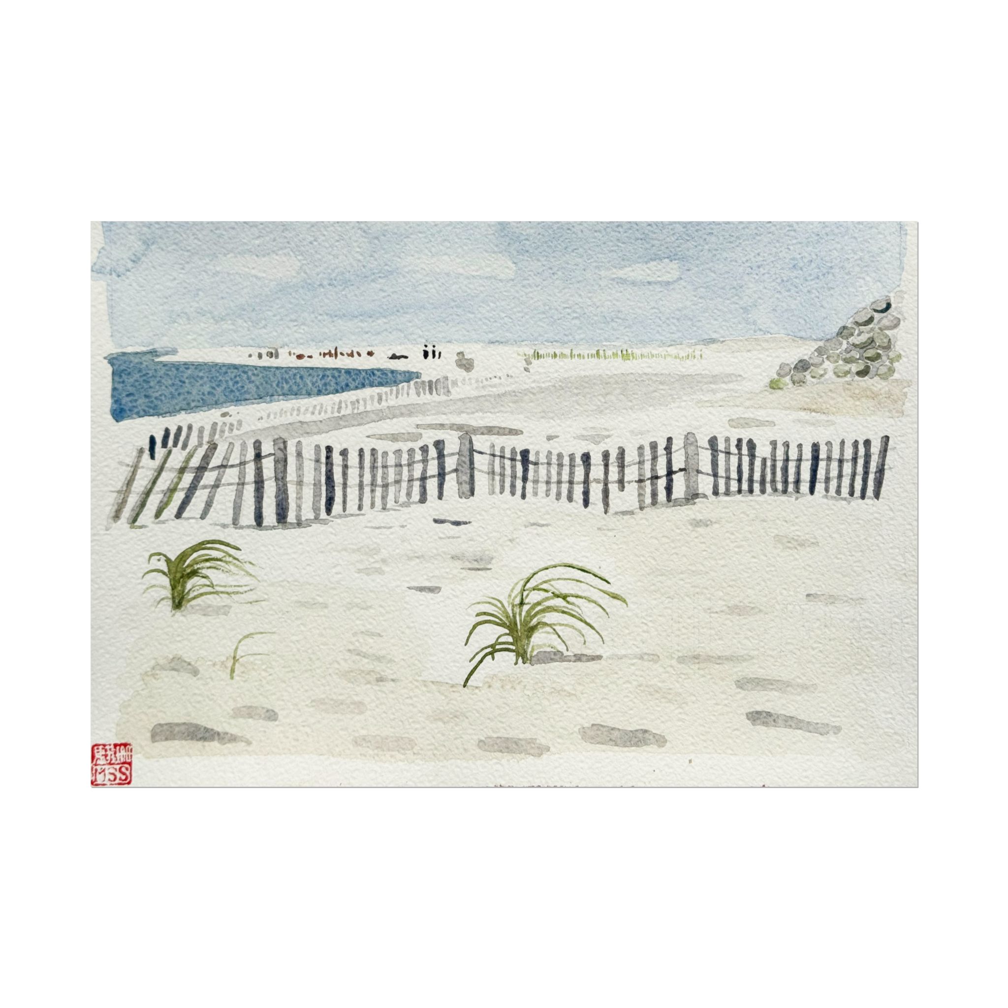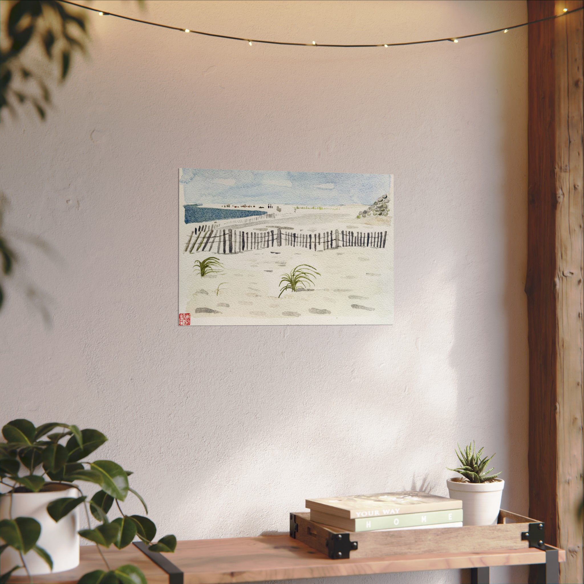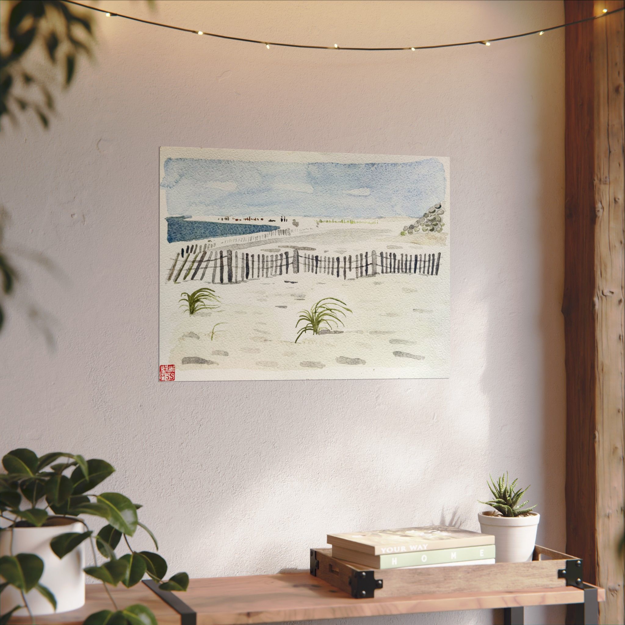 A soft, coastal watercolor scene printed on textured matte paper that feels like handmade art on your wall. Gentle washes of blues and sandy neutrals capture a quiet beach moment—dune grass, a weathered fence, and a distant pier—rendered with subtle brushstrokes and a natural paper grain that shows in every print. This poster slips easily into relaxed living rooms, sunlit hallways, or a breezy bedroom, bringing a calm, coastal mood without shouting. It complements natural wood frames, woven accents, and rooms that favor muted palettes. Hang it for a low-key reminder of slow afternoons by the shore or to complete a serene, coastal gallery wall for gatherings and quiet evenings at home.
