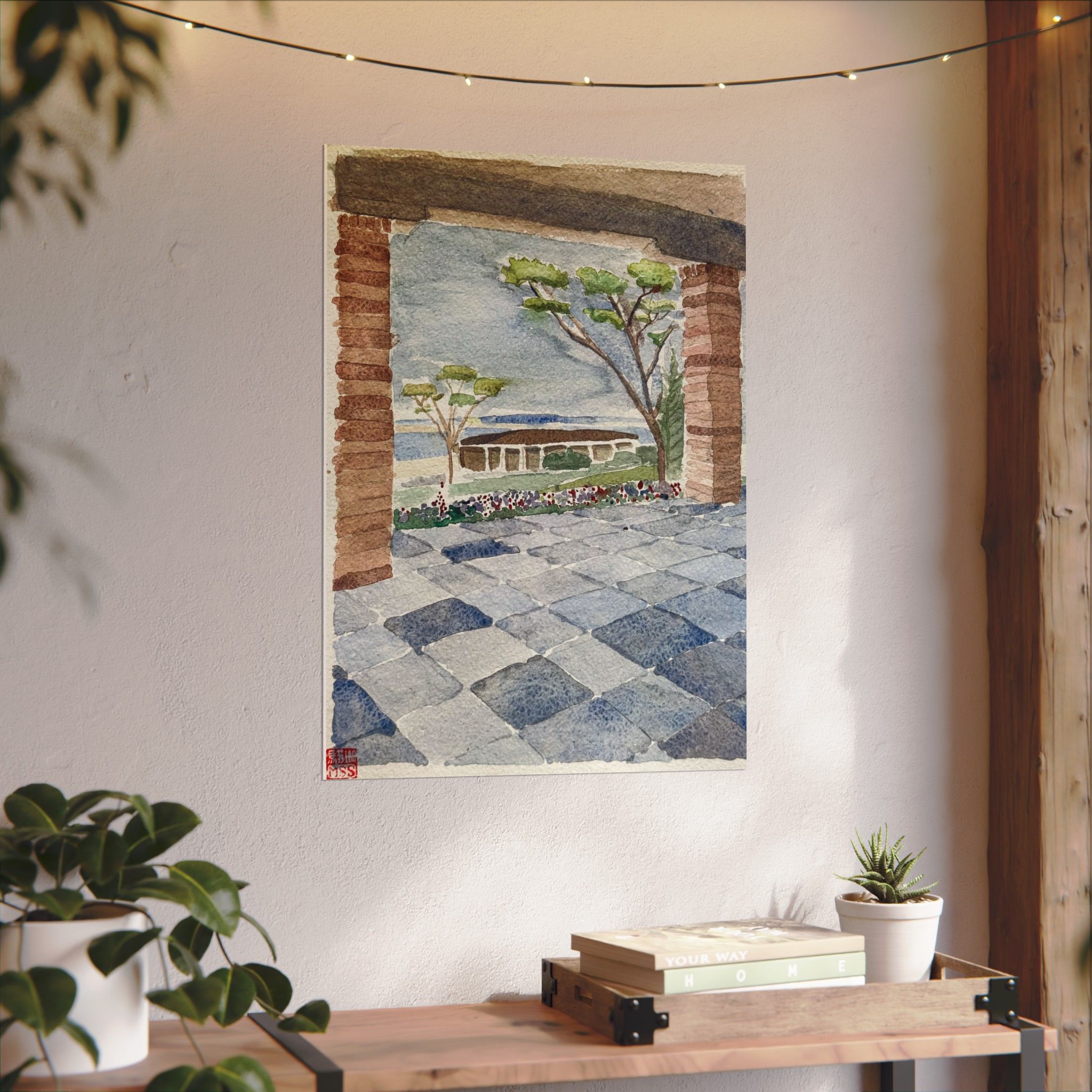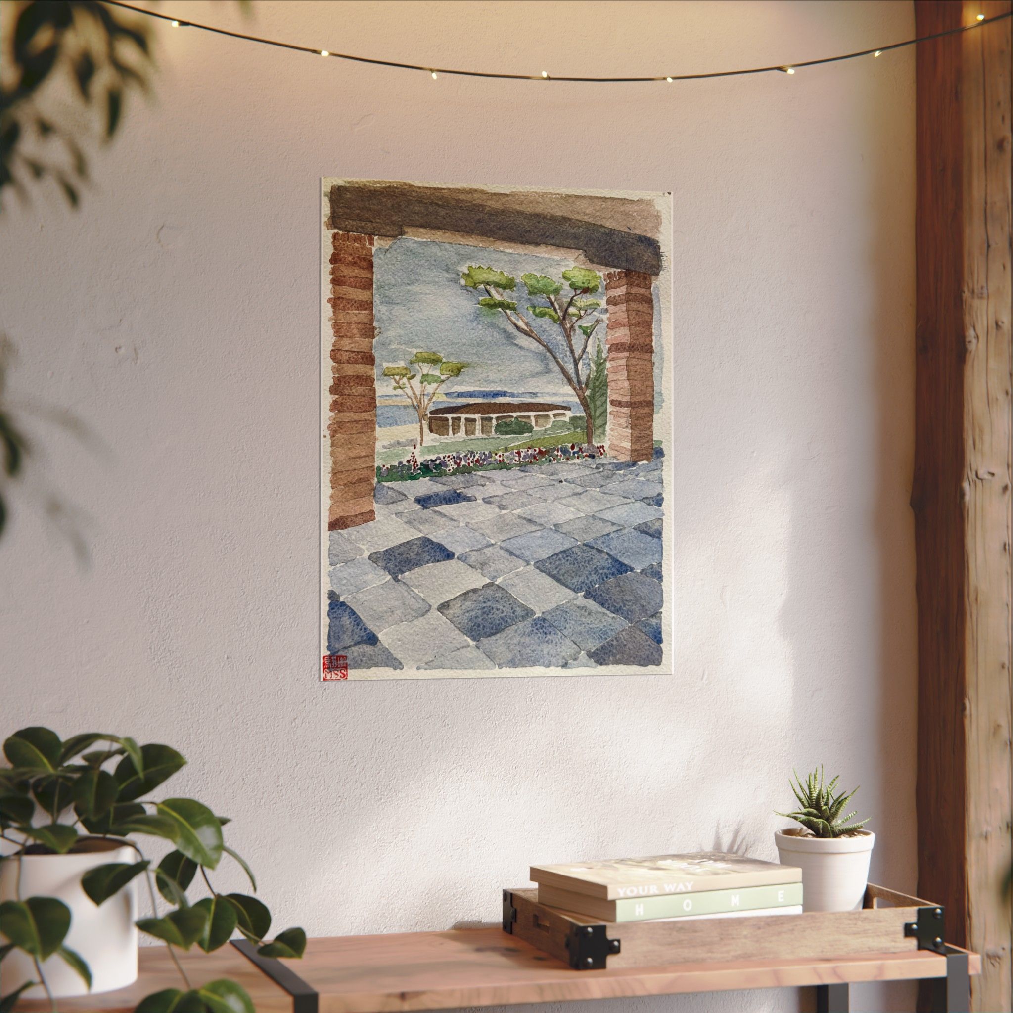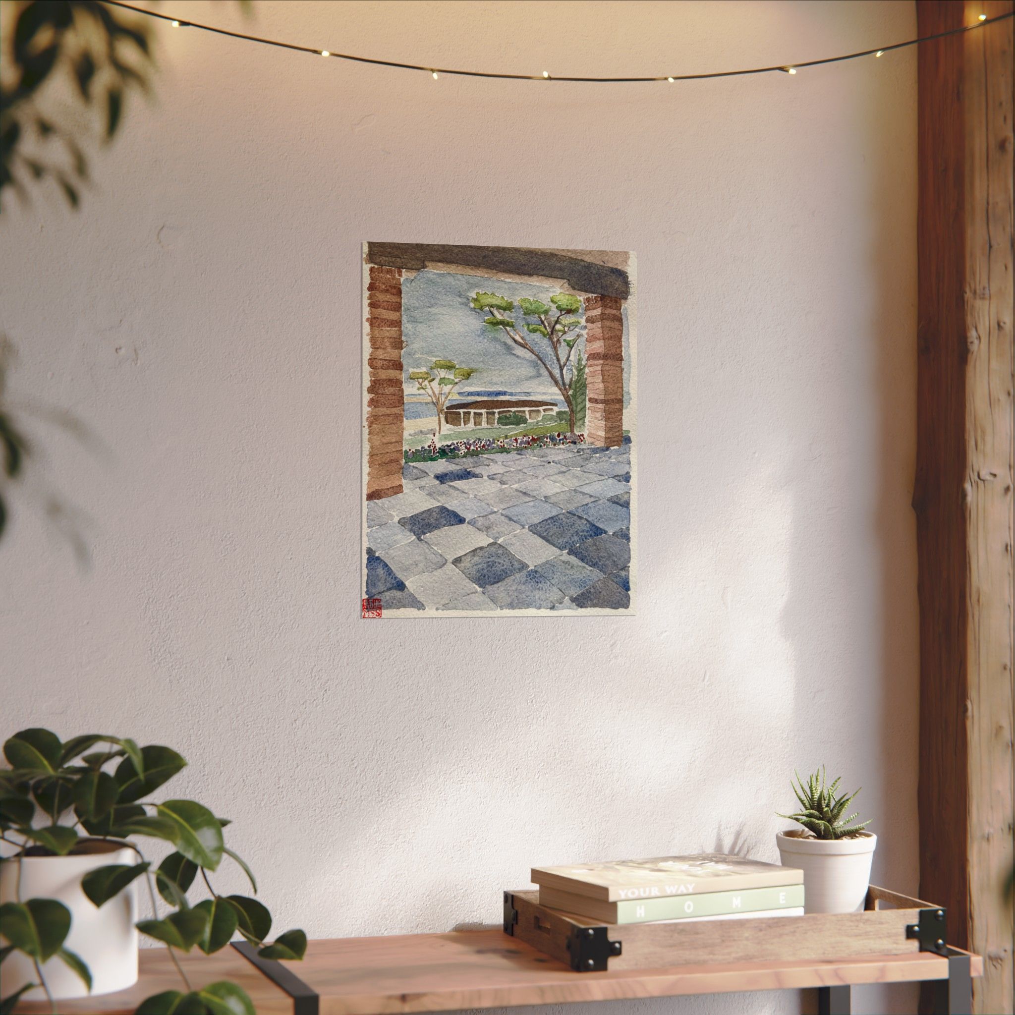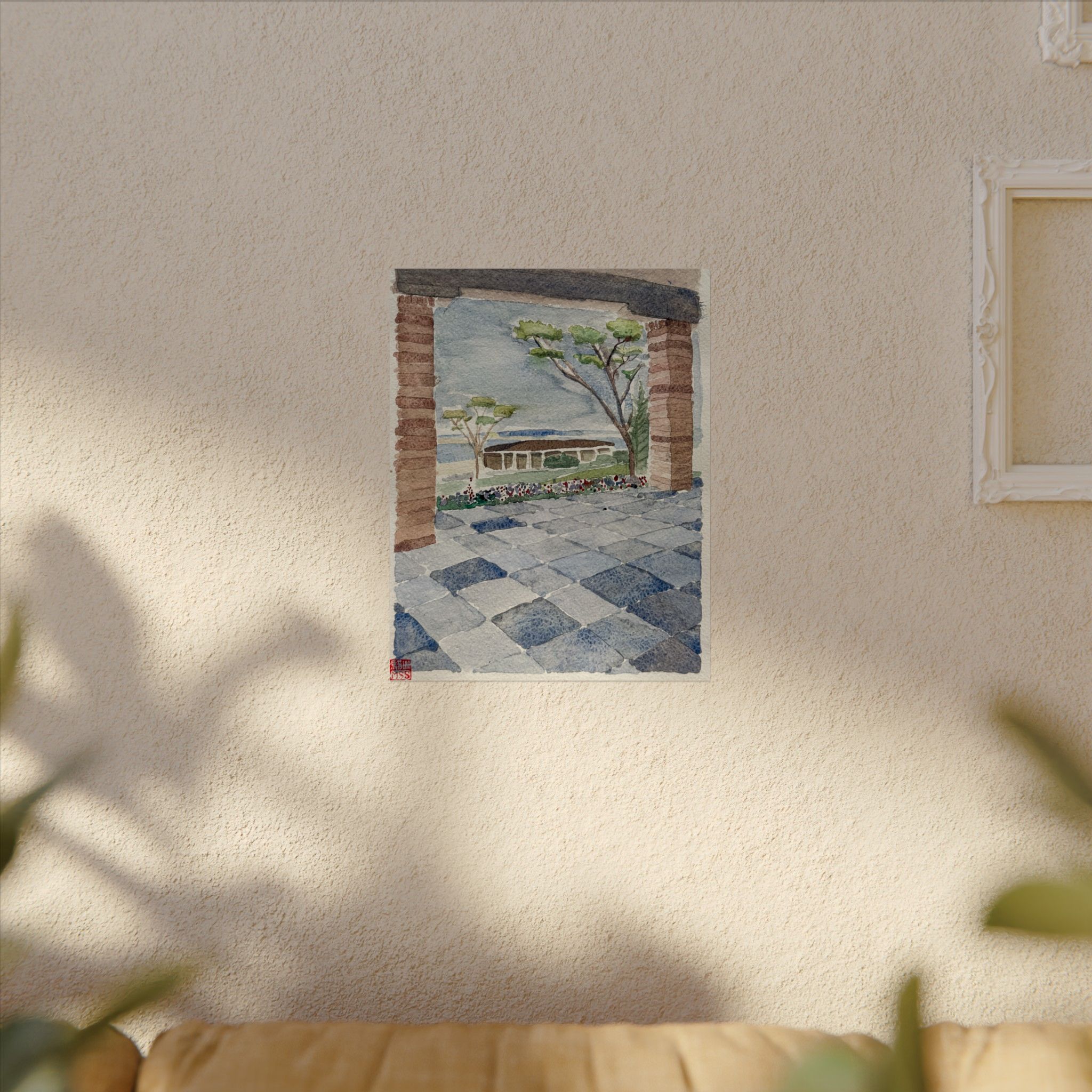 A textured watercolor matte poster that brings a quiet coastal veranda to your wall. Loose, expressive brushstrokes capture a sunlit patio of blue-and-gray tiles, framed by warm brick pillars and a breeze-swaying tree. The textured 285gsm watercolor paper and archival inks make the subtle washes and layered hues feel tactile — like a page torn from an artist’s travel sketchbook. Hang it where you want a soft, contemplative moment: near a reading nook, entryway, or above a console to invite calm and collected seaside memories into everyday life.