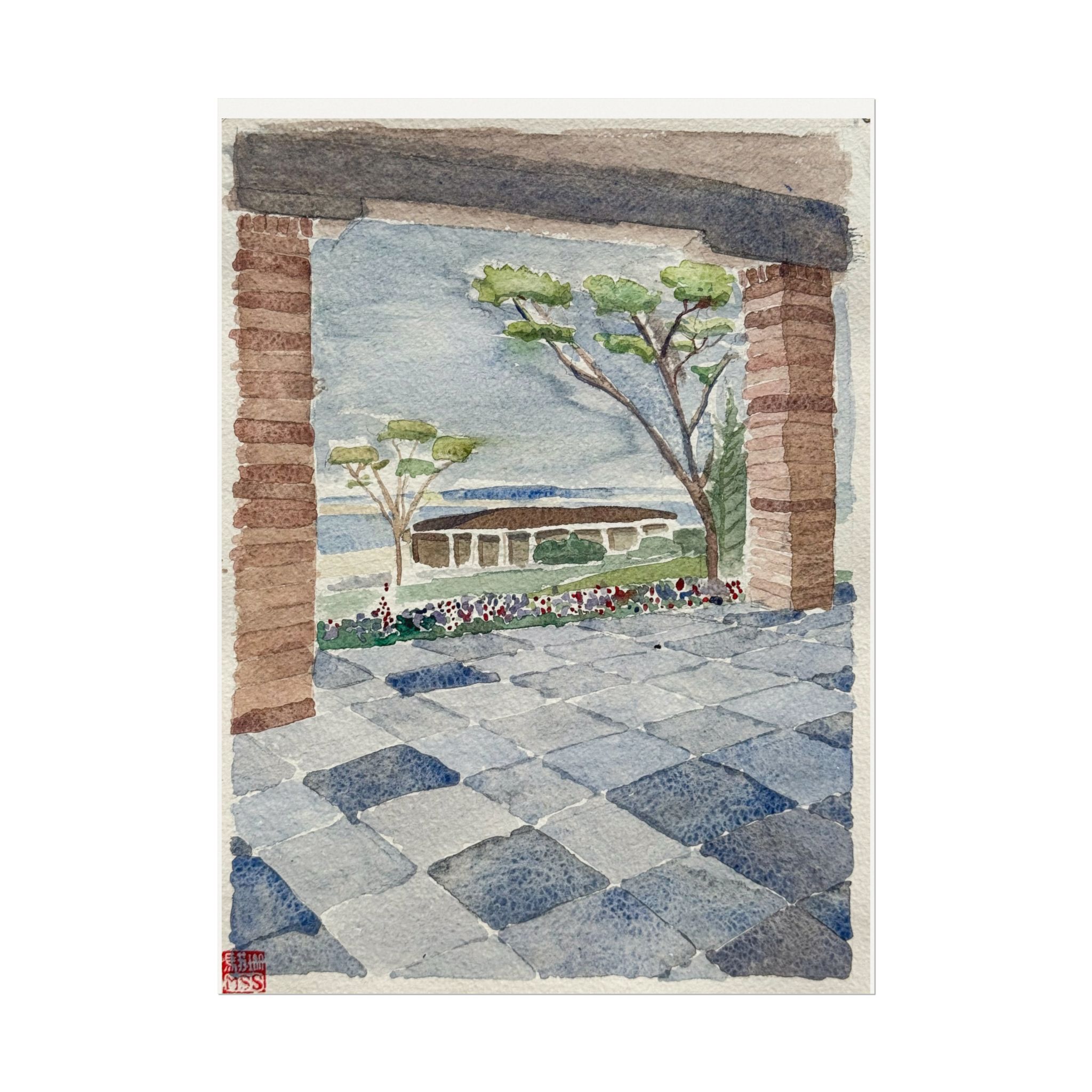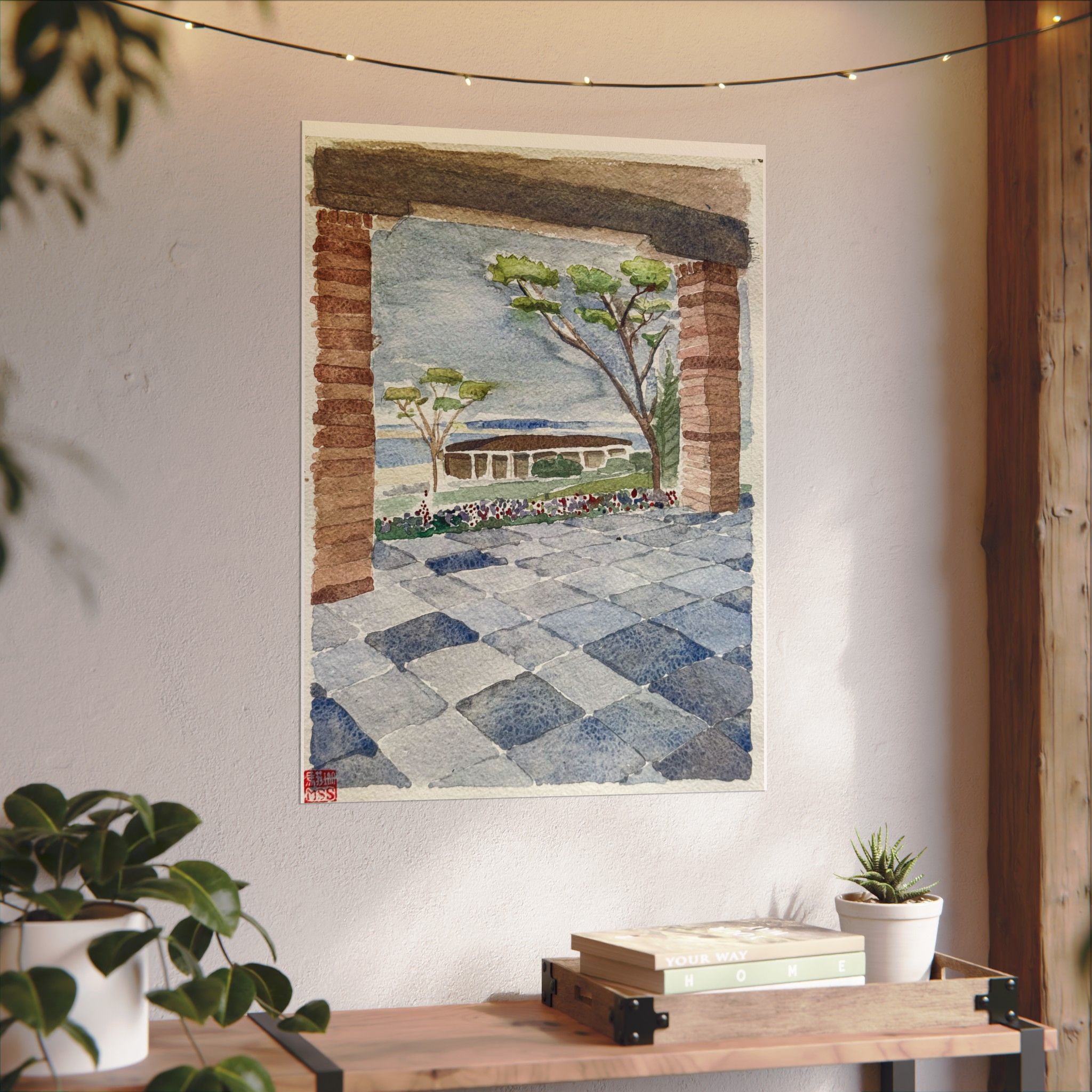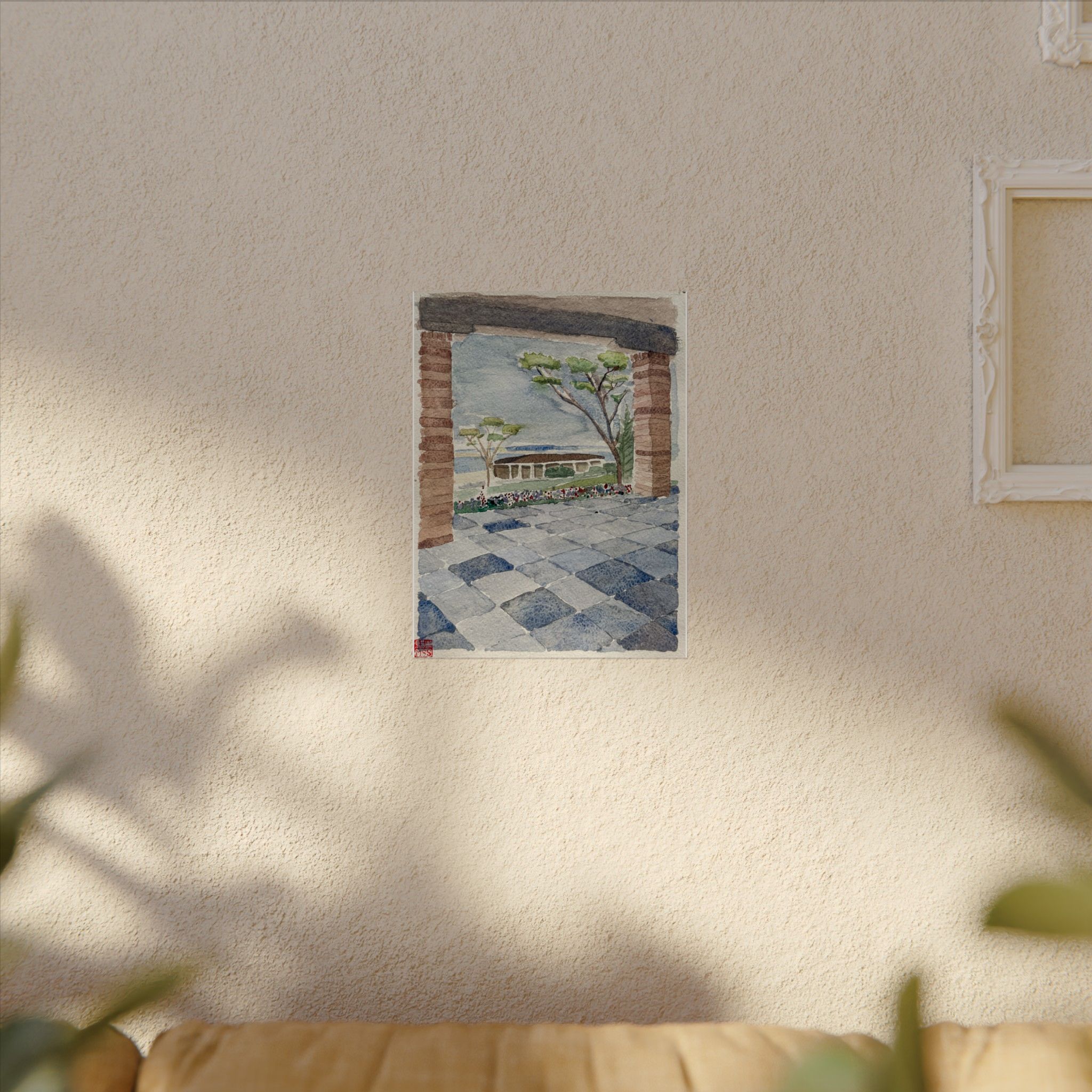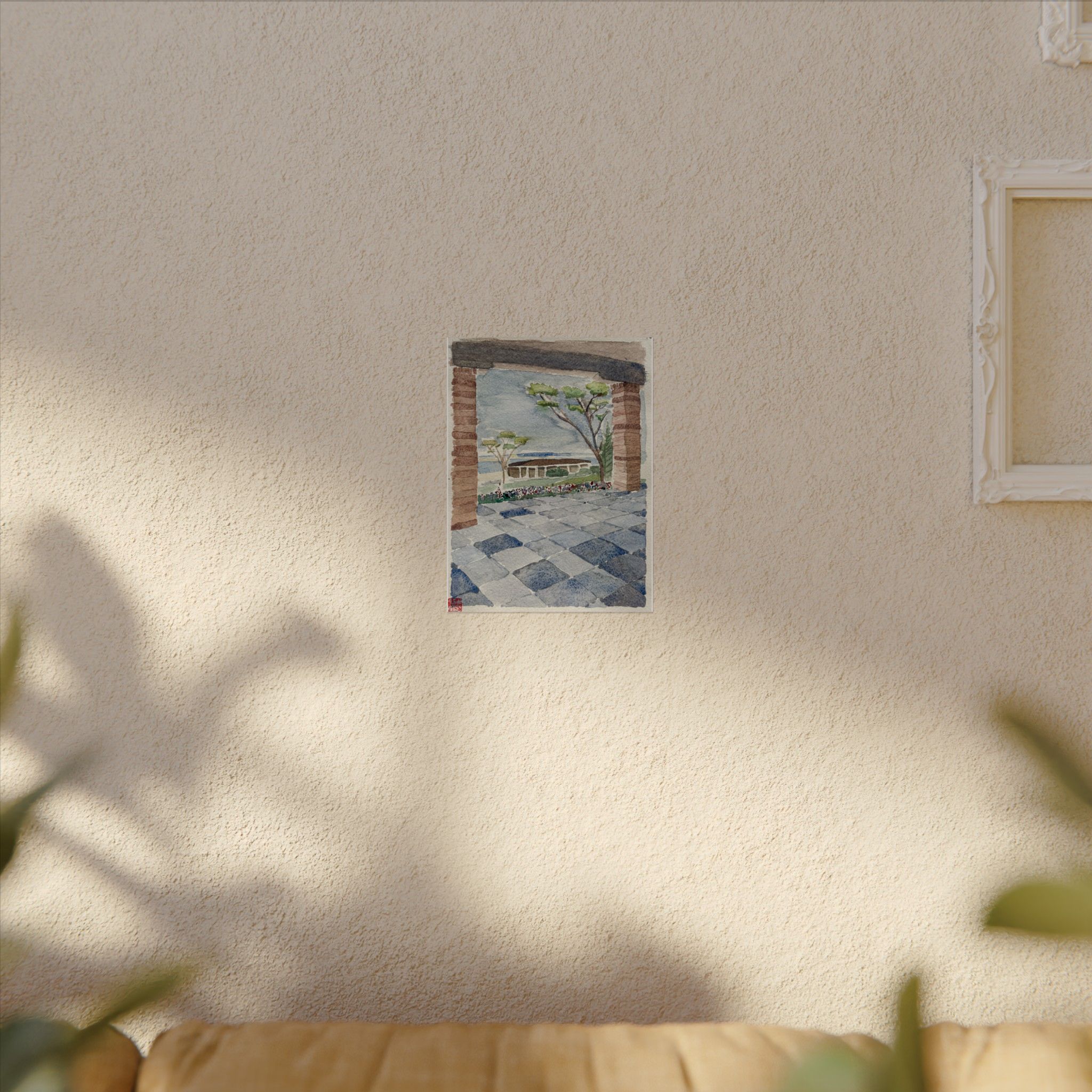 A textured watercolor matte poster that brings a quiet coastal veranda to your wall. Loose, expressive brushstrokes capture a sunlit patio of blue-and-gray tiles, framed by warm brick pillars and a breeze-swaying tree. The textured 285gsm watercolor paper and archival inks make the subtle washes and layered hues feel tactile — like a page torn from an artist’s travel sketchbook. Hang it where you want a soft, contemplative moment: near a reading nook, entryway, or above a console to invite calm and collected seaside memories into everyday life.