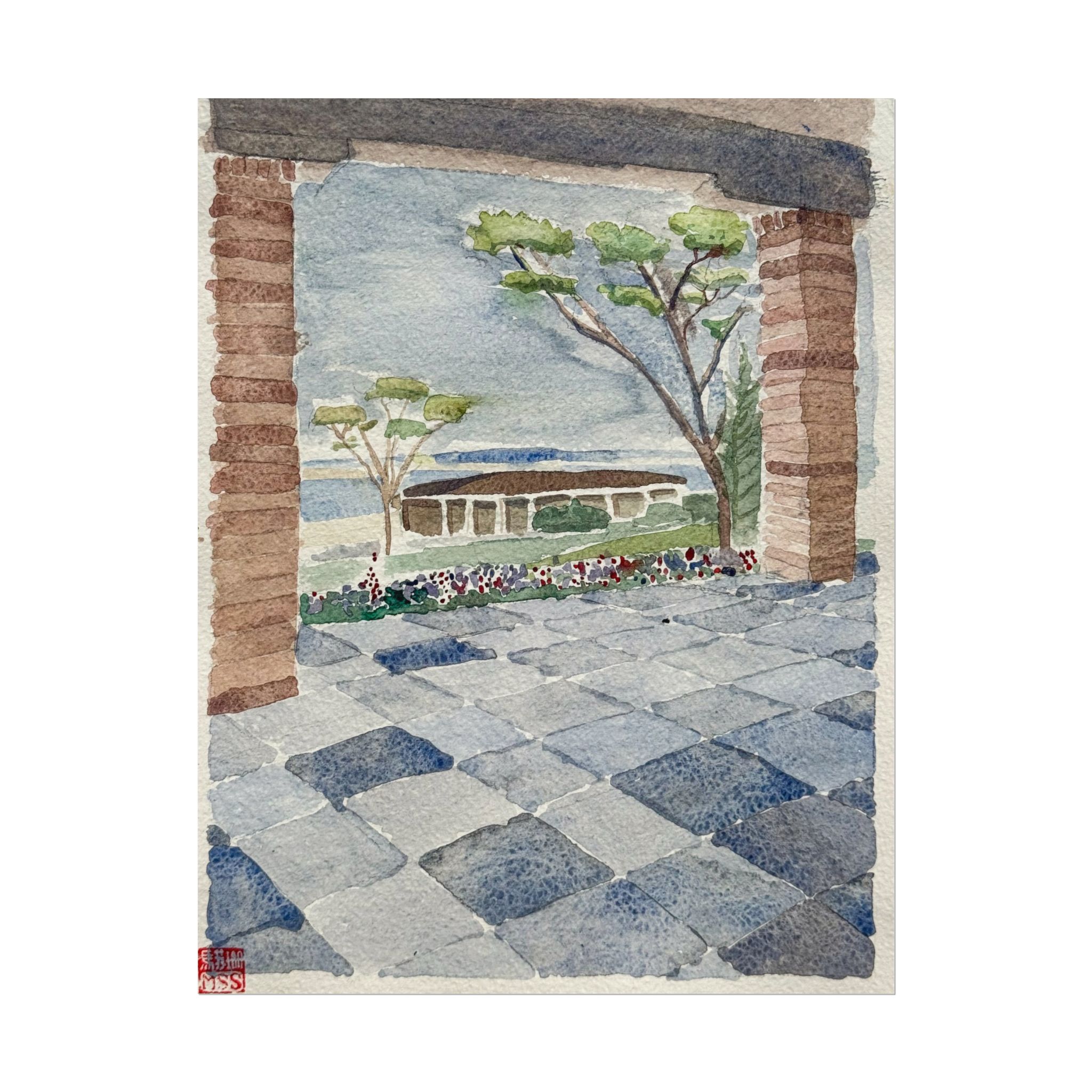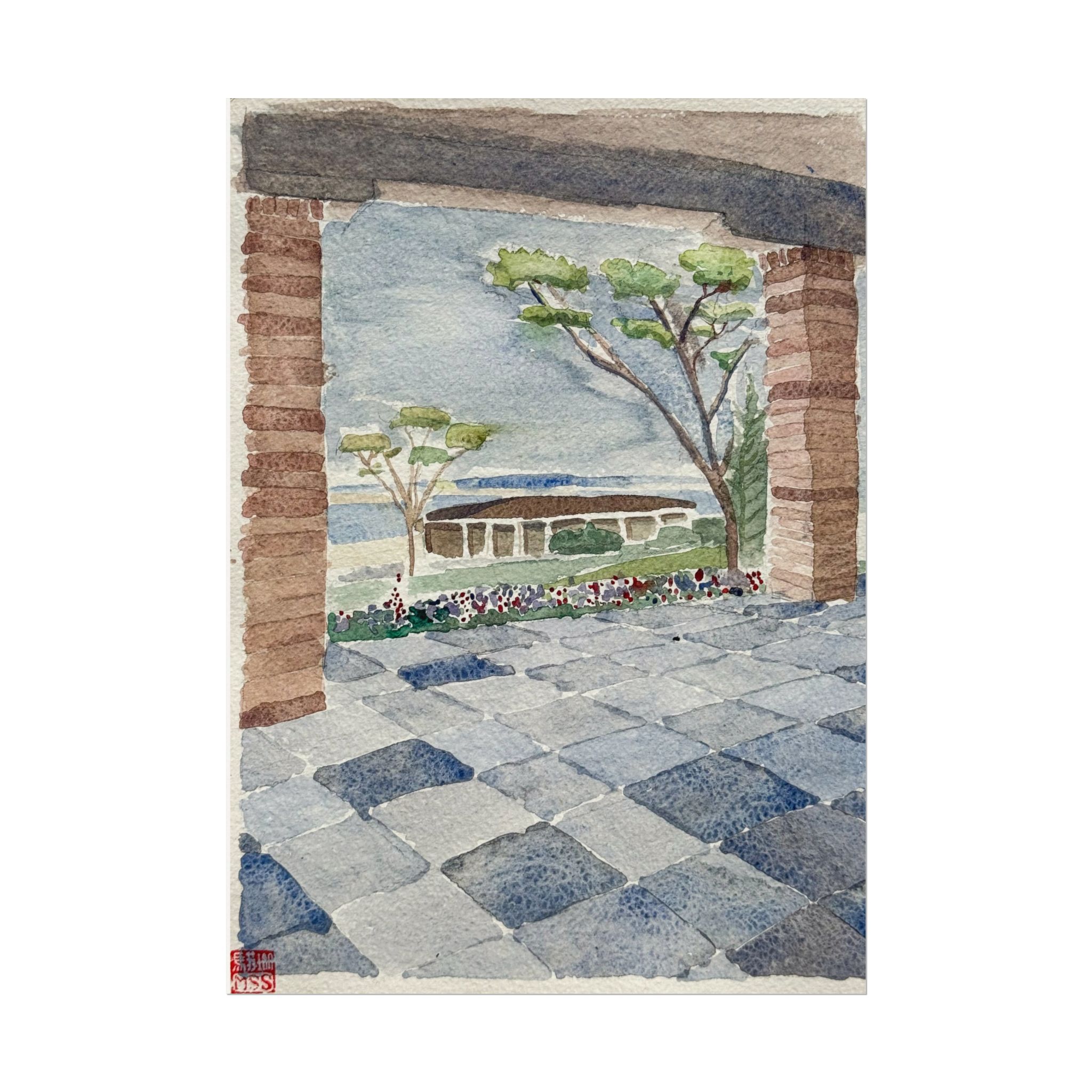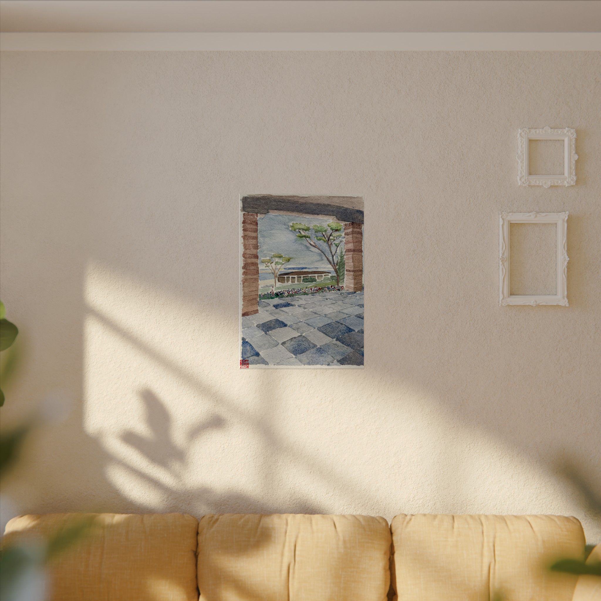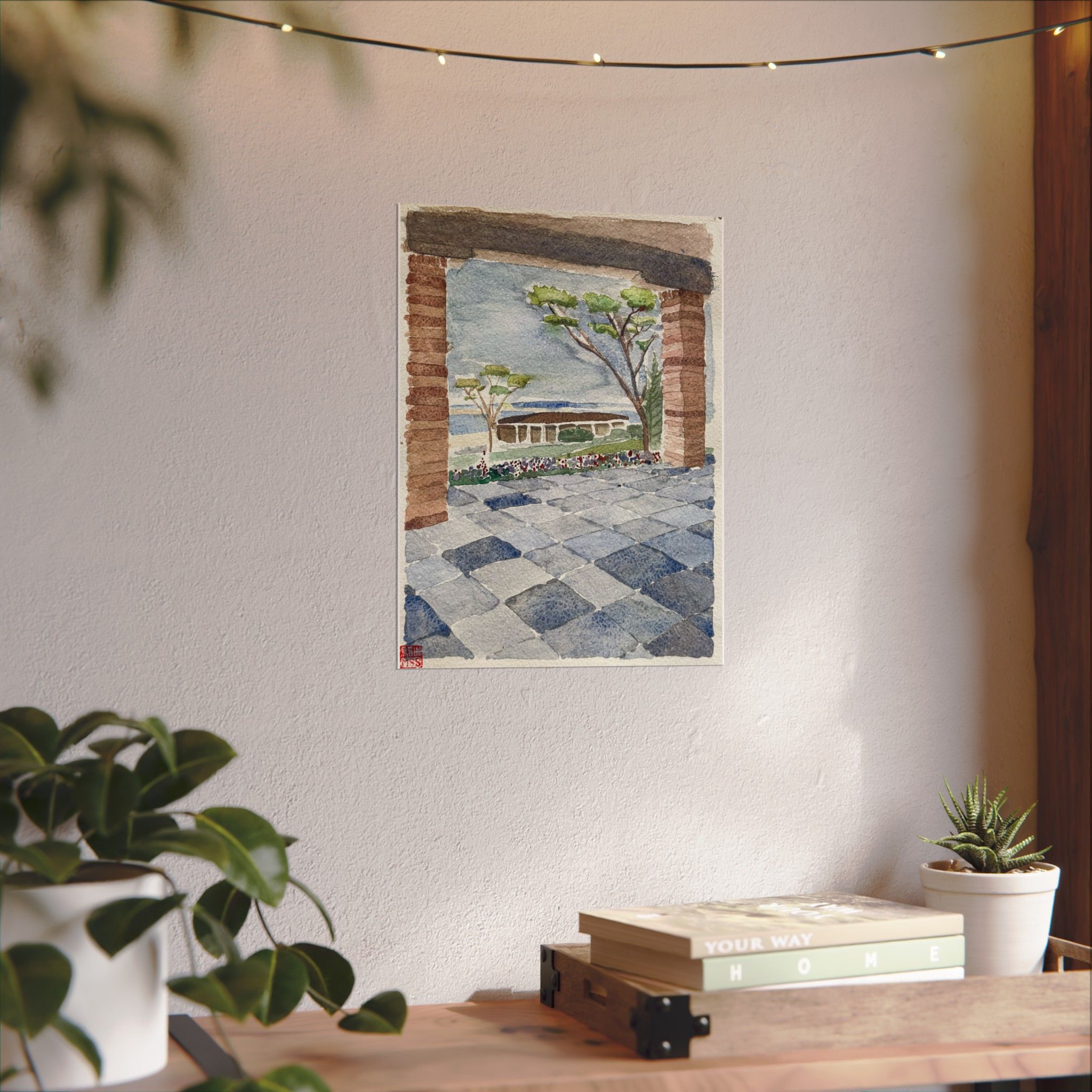 A textured watercolor matte poster that brings a quiet coastal veranda to your wall. Loose, expressive brushstrokes capture a sunlit patio of blue-and-gray tiles, framed by warm brick pillars and a breeze-swaying tree. The textured 285gsm watercolor paper and archival inks make the subtle washes and layered hues feel tactile — like a page torn from an artist’s travel sketchbook. Hang it where you want a soft, contemplative moment: near a reading nook, entryway, or above a console to invite calm and collected seaside memories into everyday life.