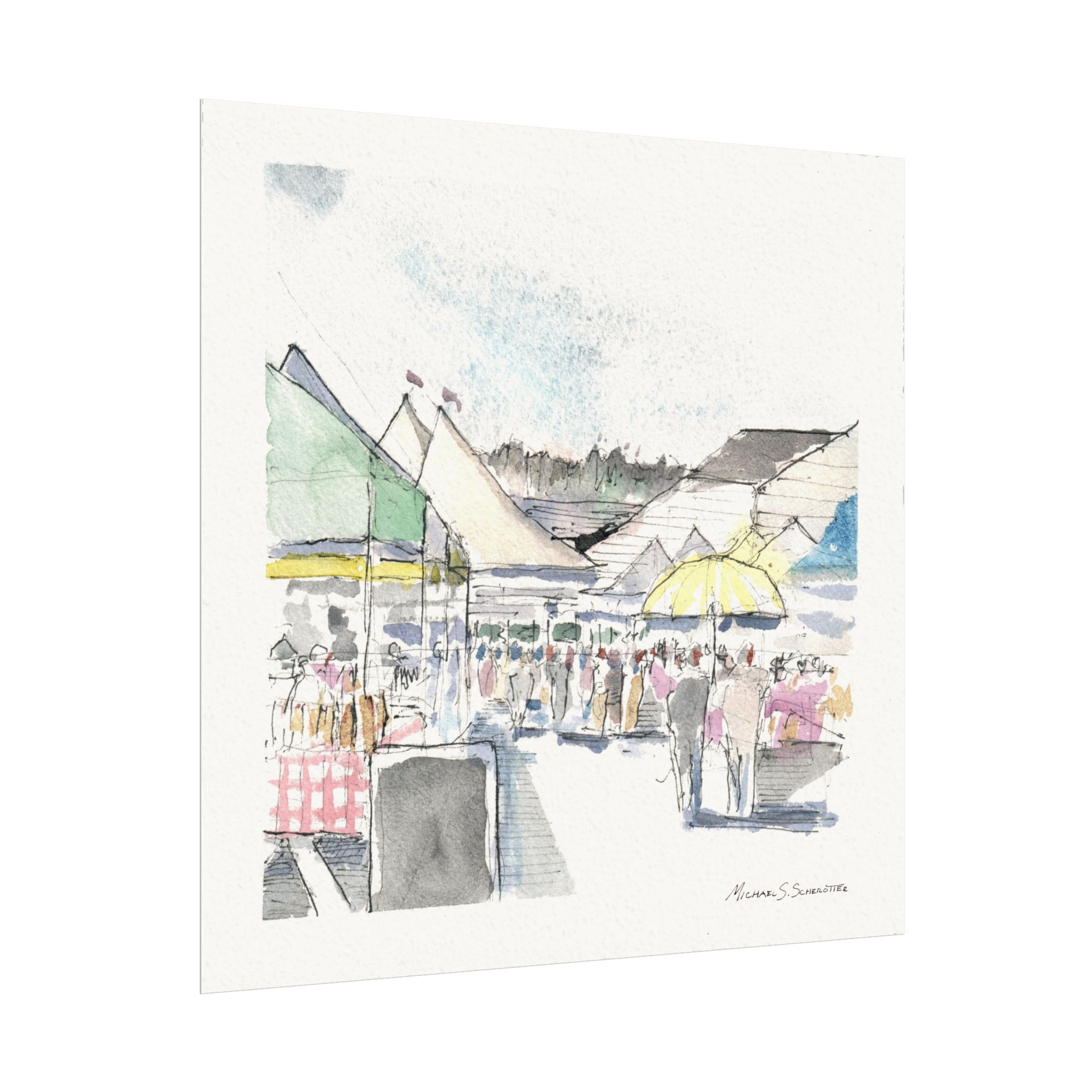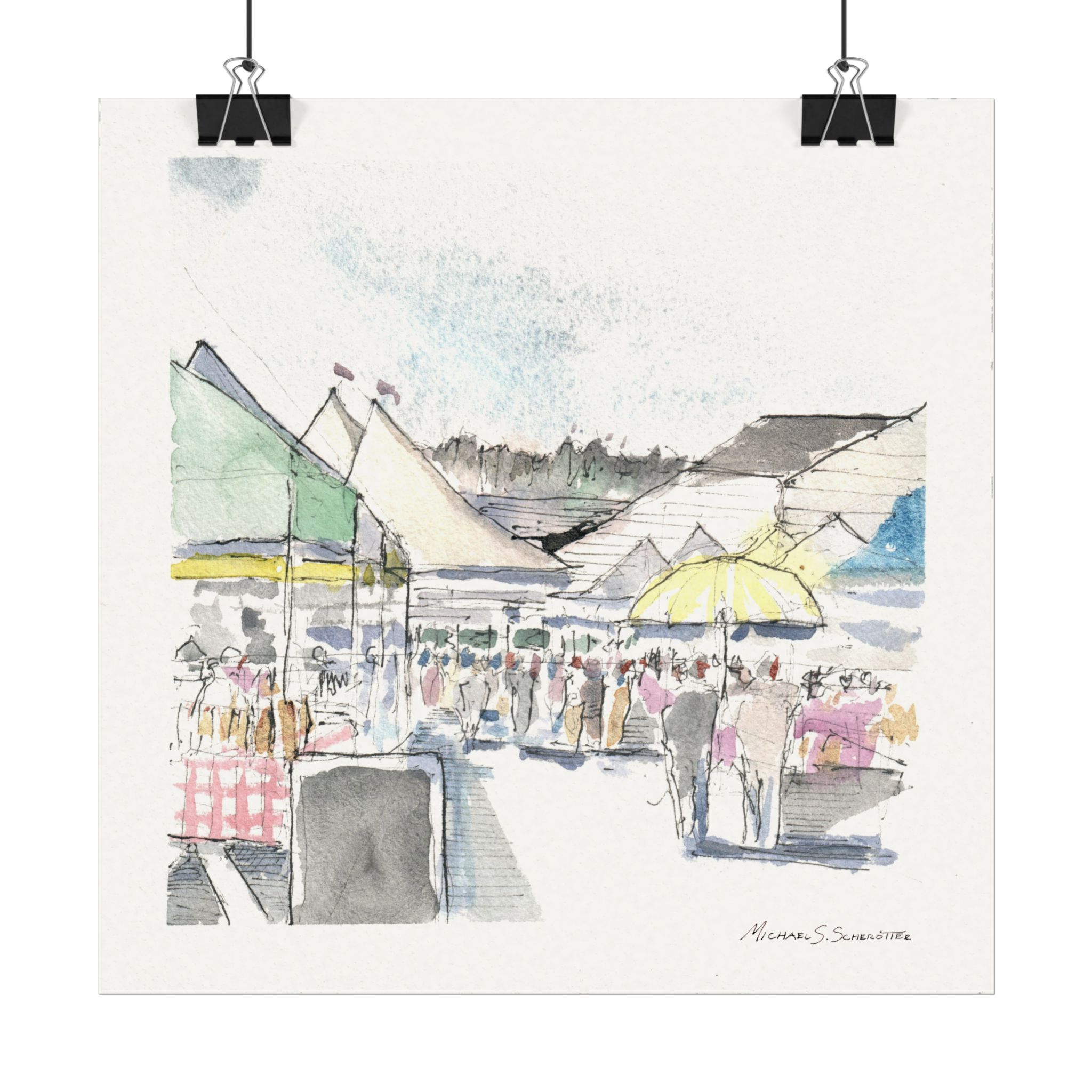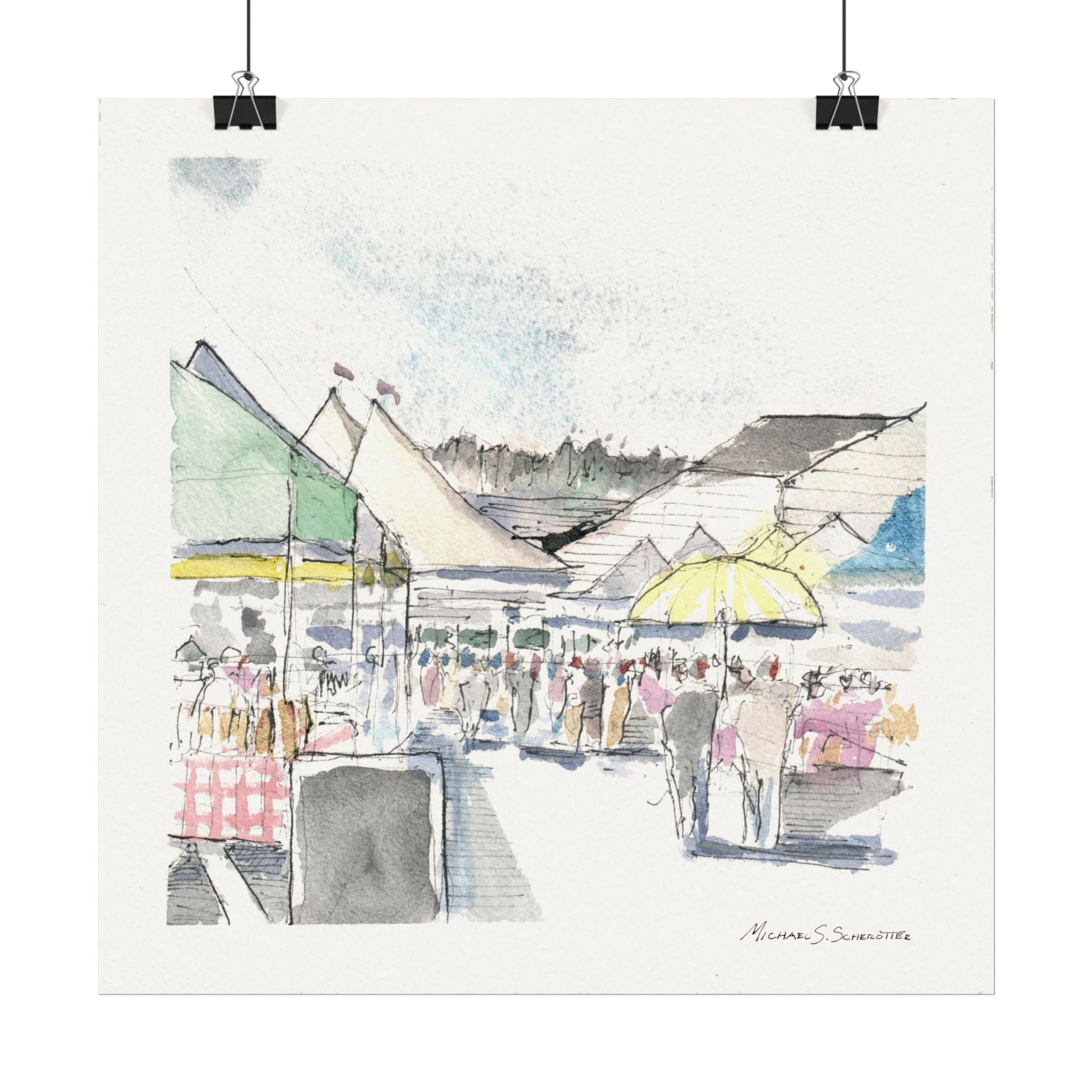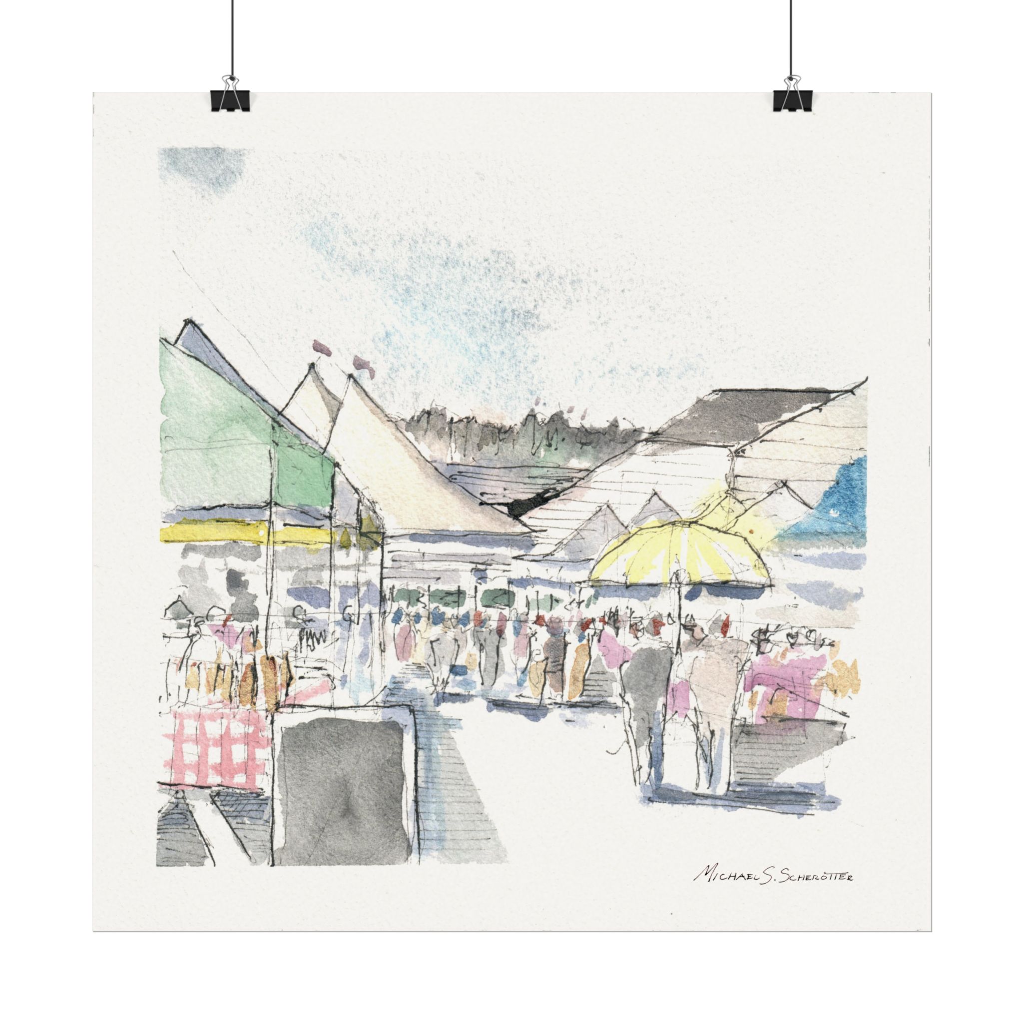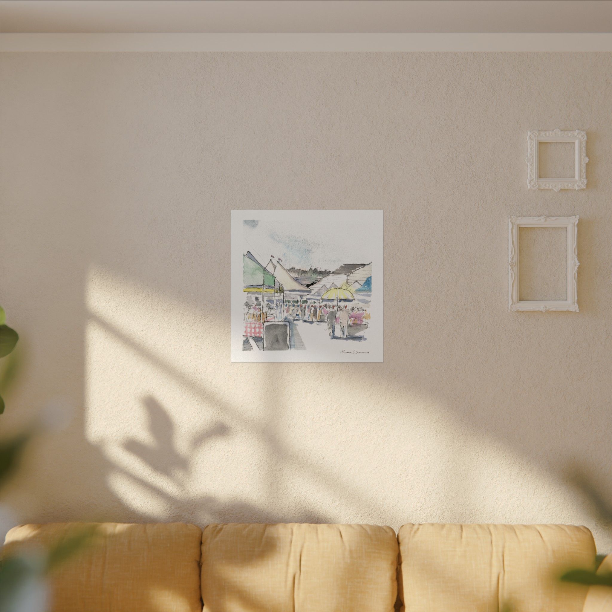 A soft, airy watercolor poster that captures the gentle bustle of a seaside market. Subtle washes of pastel green, yellow, and blue blend with delicate graphite lines to suggest tents, umbrellas, and wandering figures without overwhelming detail. The textured matte surface and 285gsm watercolor paper give each brushstroke a tactile, painterly presence—like a quiet memory you can hang on the wall. It brings calm, casual energy to entryways, kitchens, or sitting rooms and fits into layered, light-filled interiors that favor artisan-made touches.