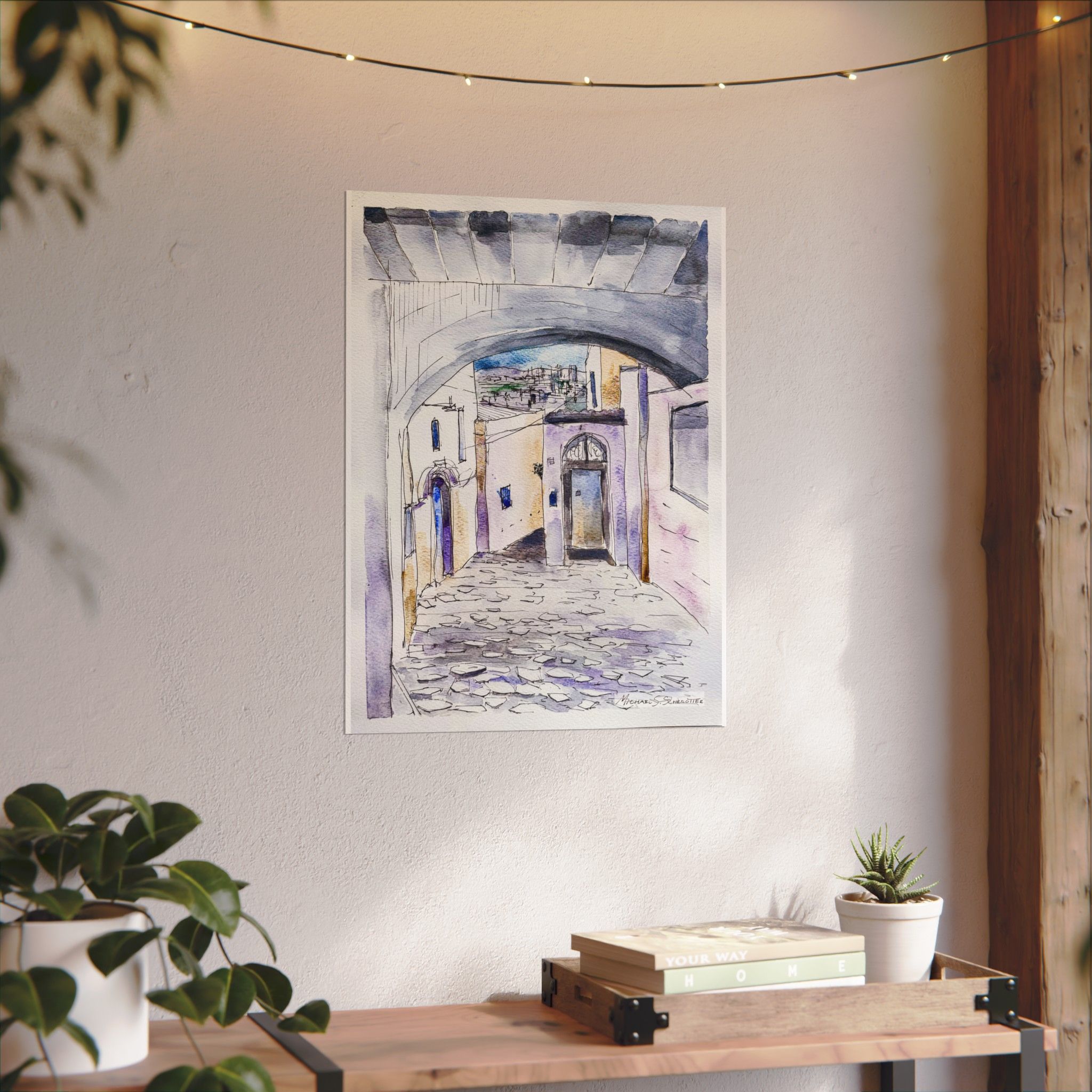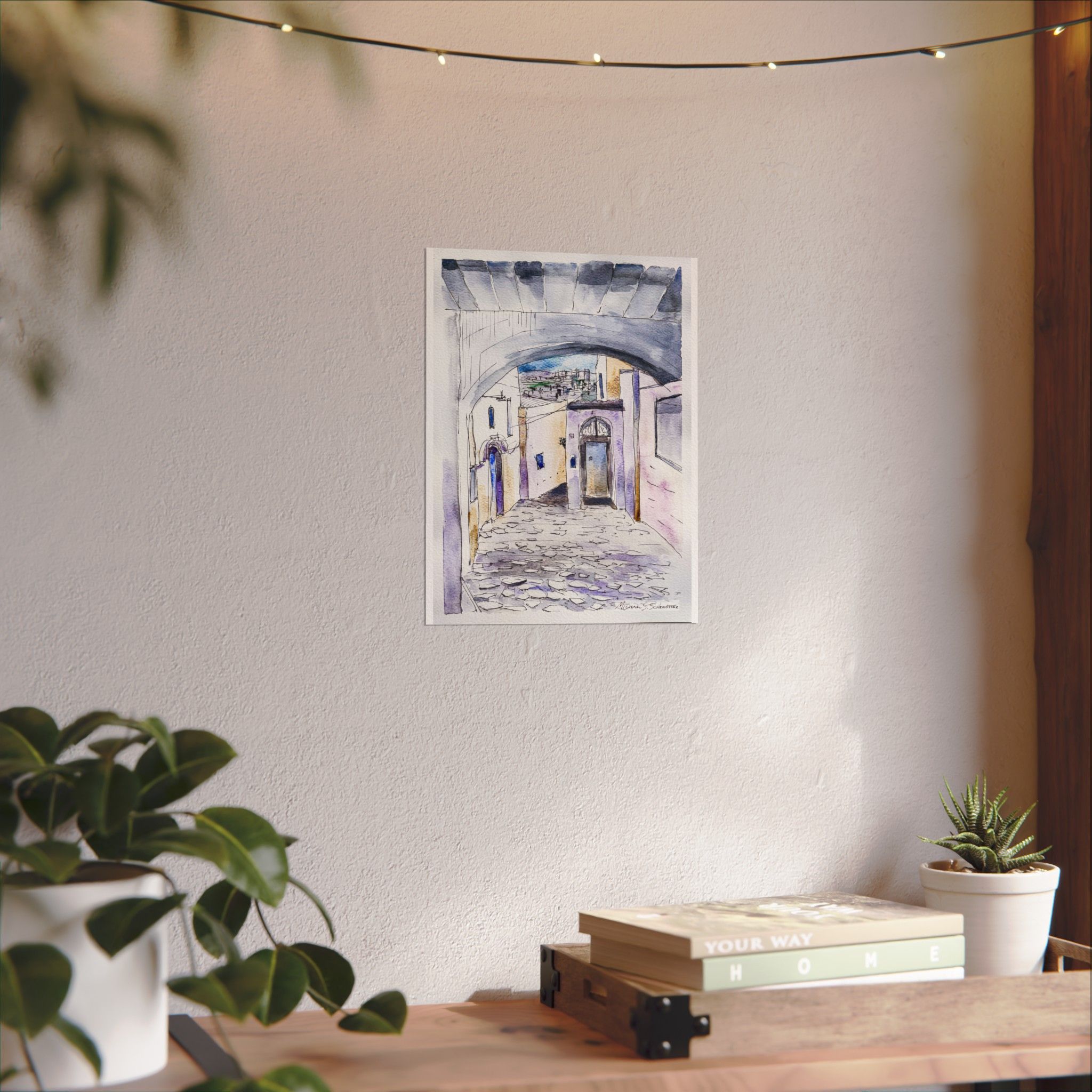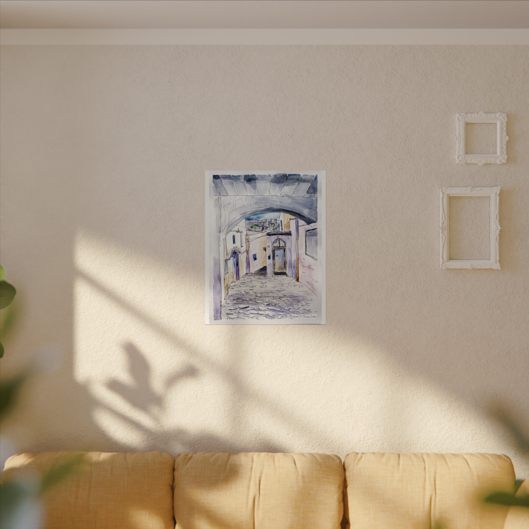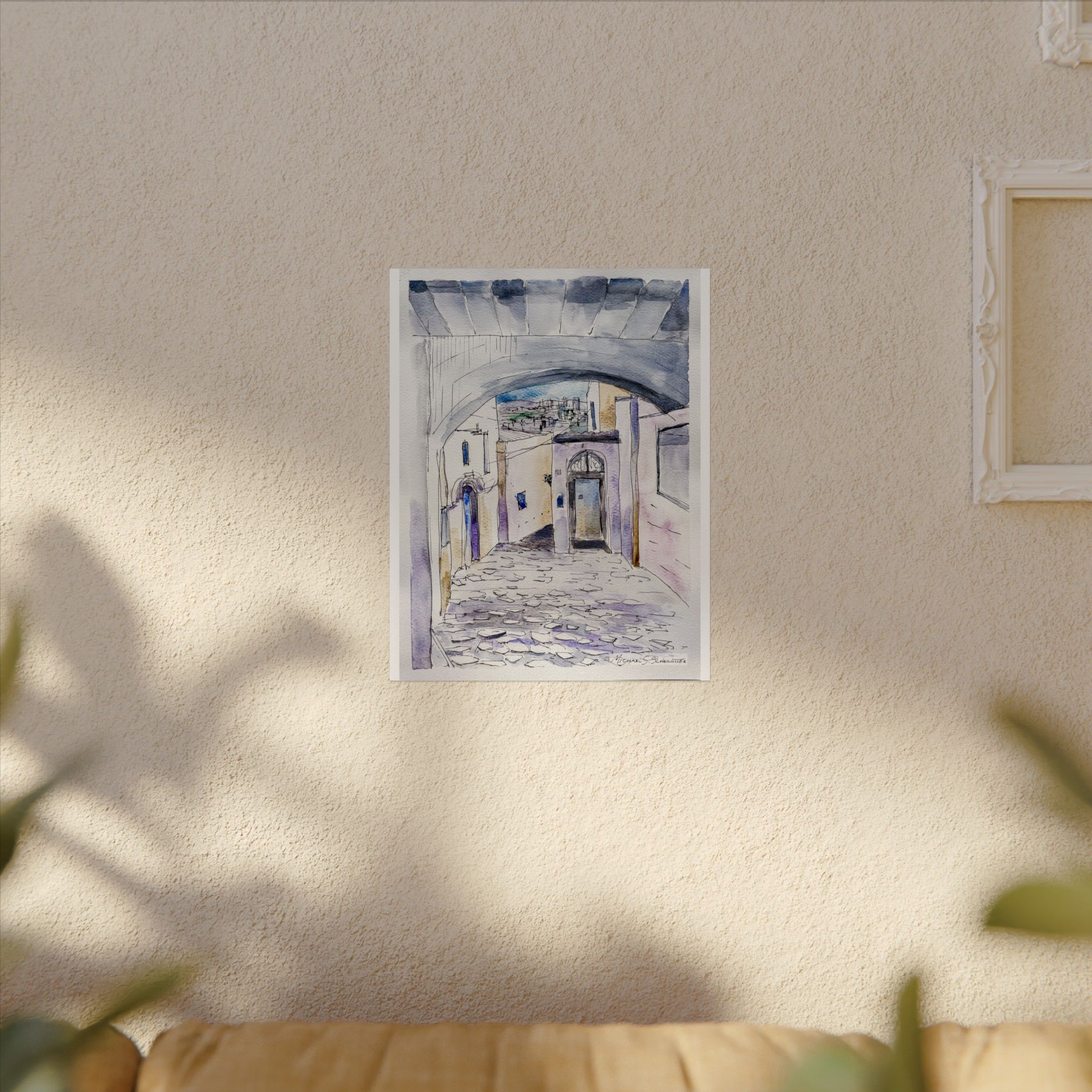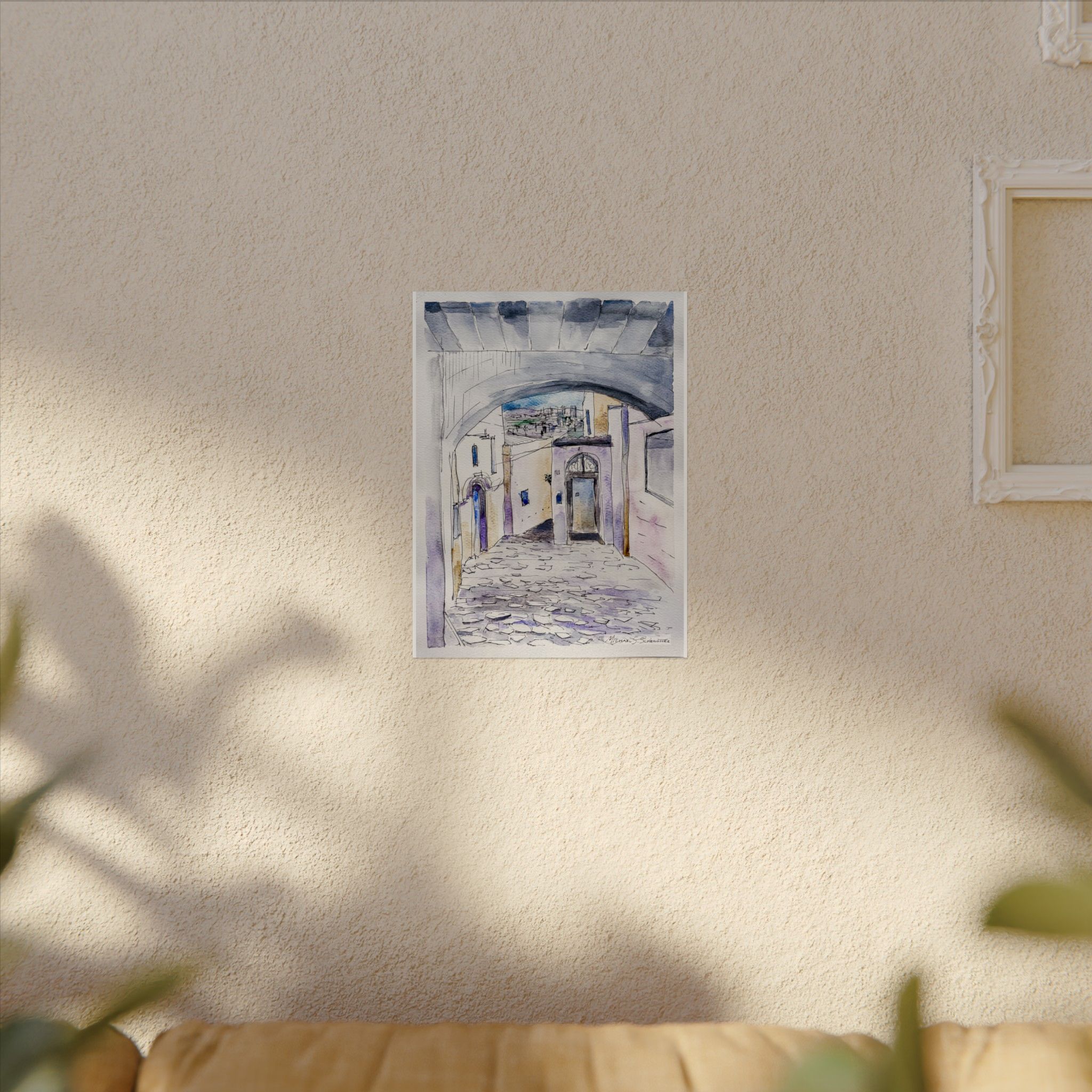 Bring a quiet Mediterranean moment into your home with this textured watercolor matte poster. Gentle washes of lavender, soft stone grays, and sun-bleached cream create a narrow cobblestone lane beneath an arched passage — the kind of view that invites slow afternoons, whispered footsteps, and daydreams of travel. The paper’s subtle tooth gives the wash depth and a handcrafted feel, so the image reads like an original watercolor on the wall. Hang it where you pause: above a reading nook, beside a kitchen window, or in a hallway that needs a breath of seaside light.
