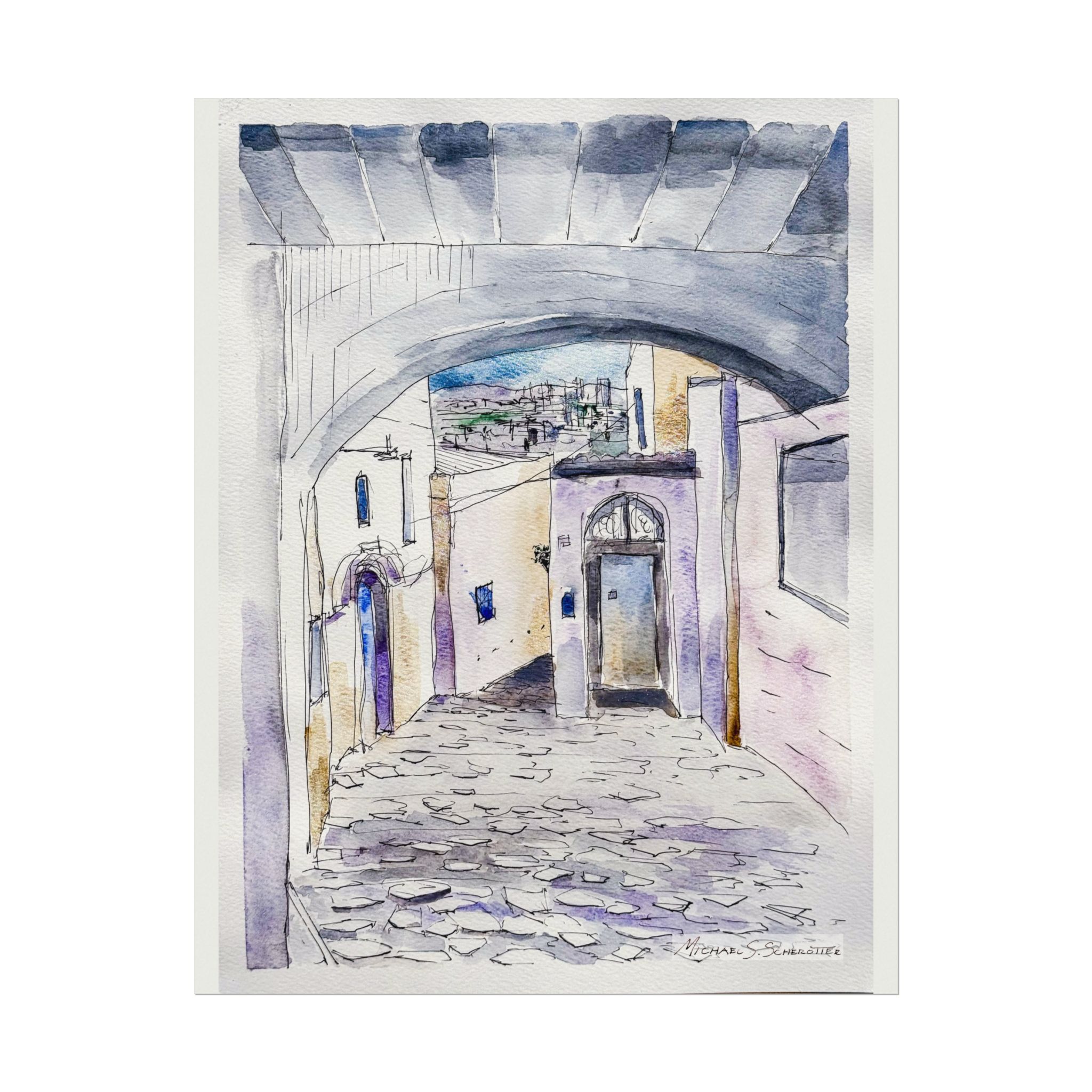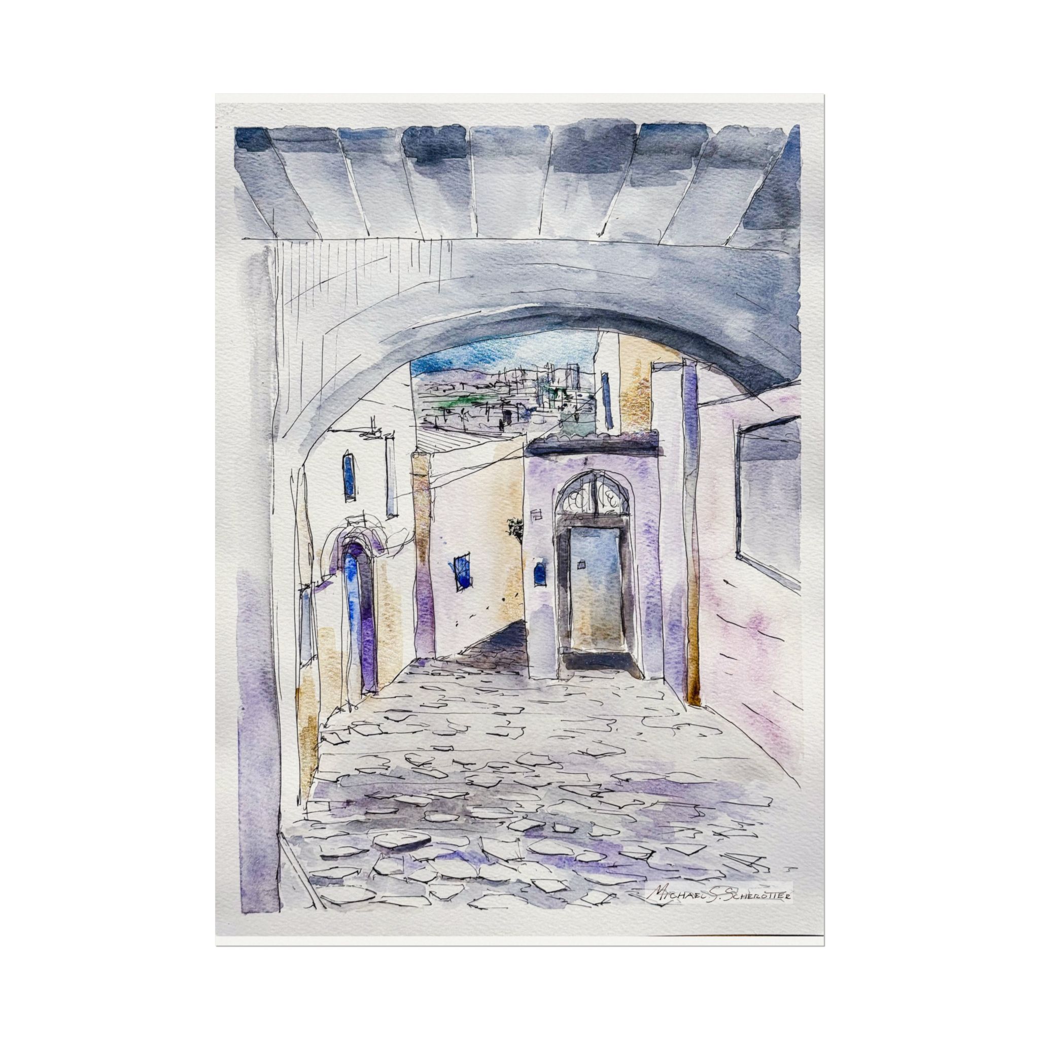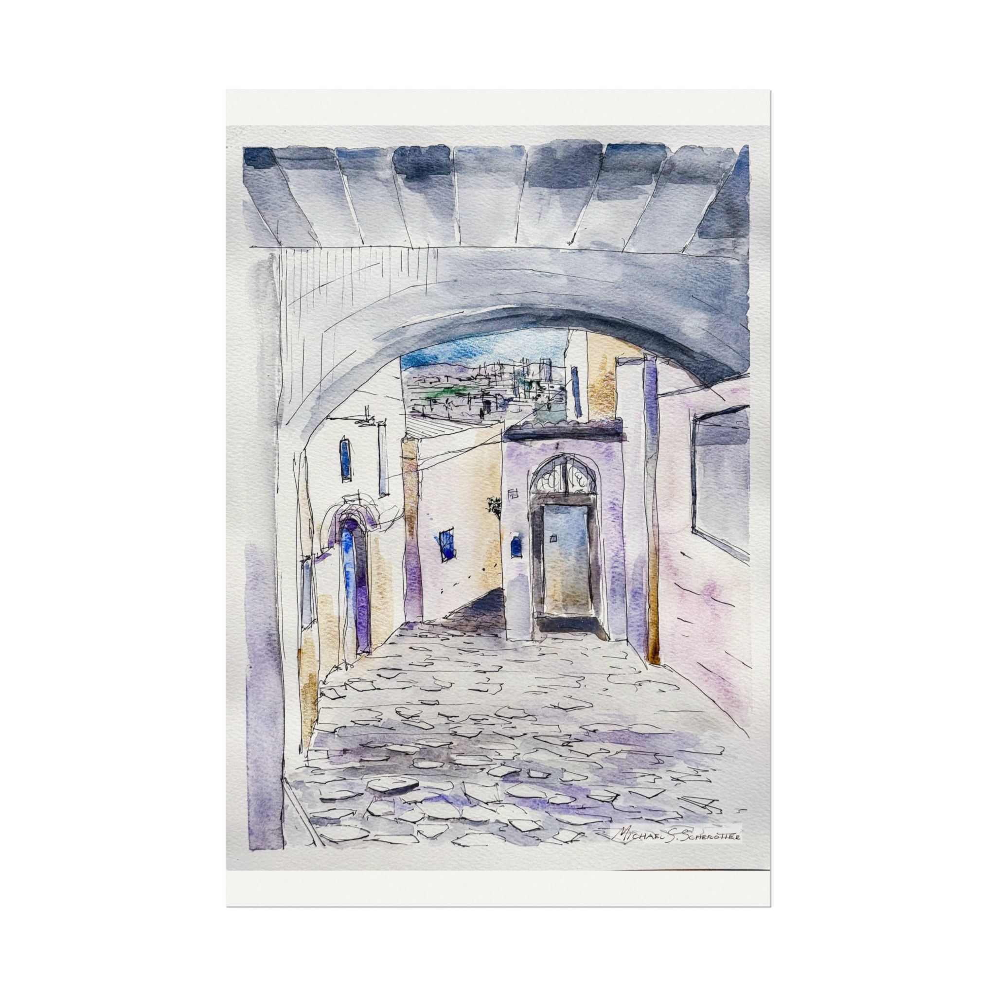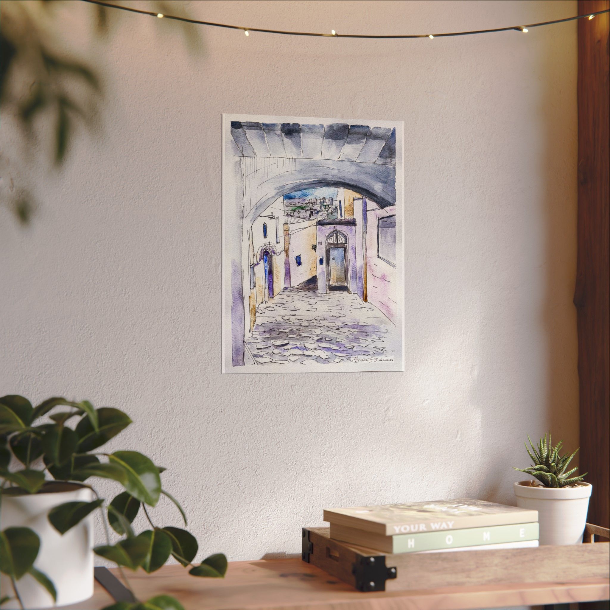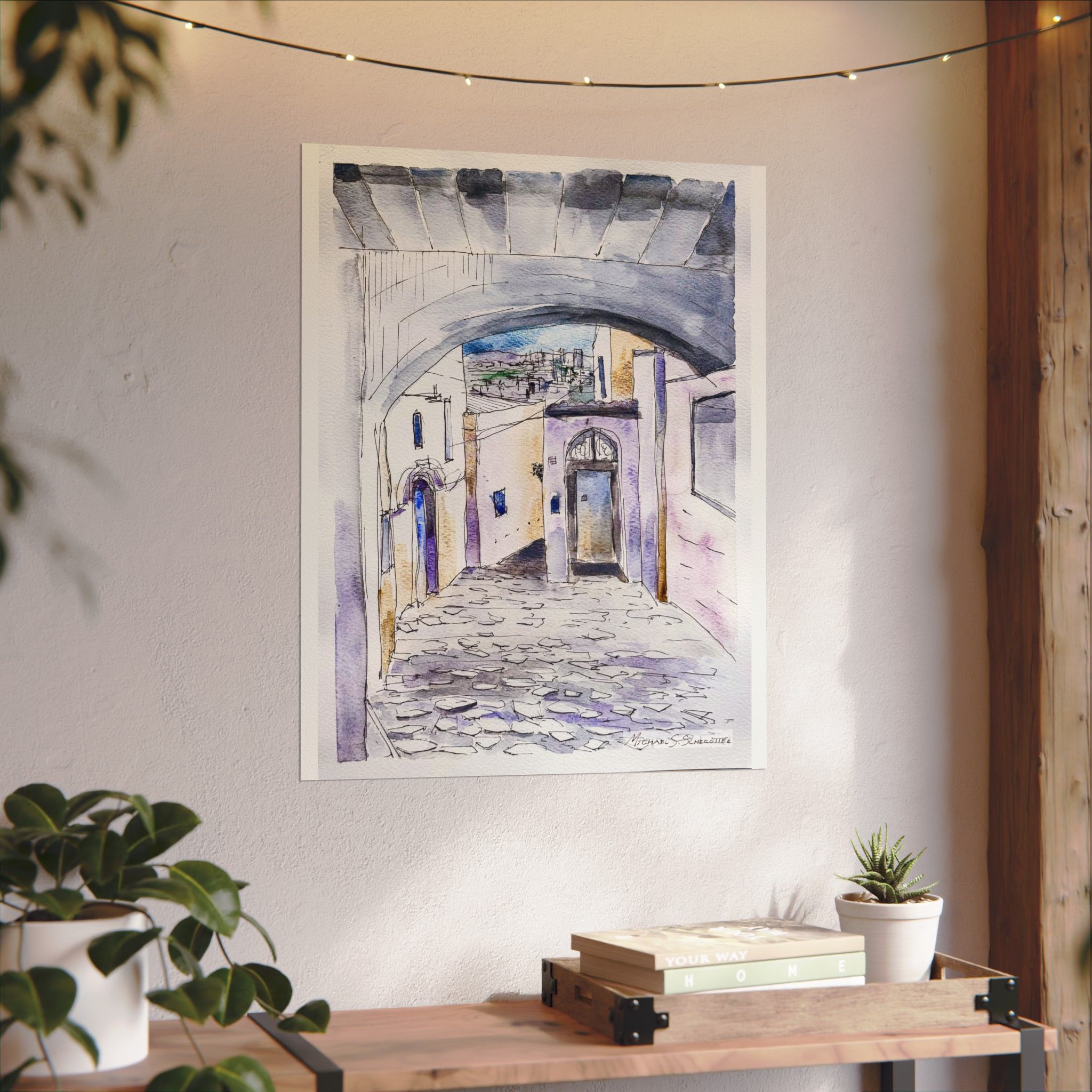 Bring a quiet Mediterranean moment into your home with this textured watercolor matte poster. Gentle washes of lavender, soft stone grays, and sun-bleached cream create a narrow cobblestone lane beneath an arched passage — the kind of view that invites slow afternoons, whispered footsteps, and daydreams of travel. The paper’s subtle tooth gives the wash depth and a handcrafted feel, so the image reads like an original watercolor on the wall. Hang it where you pause: above a reading nook, beside a kitchen window, or in a hallway that needs a breath of seaside light.